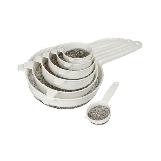 This is a mesh strainer made of durable stainless steel. It is available in assorted sizes for your selection. This practical tool features a convenient eyelet in the handle for creative storage solutions.