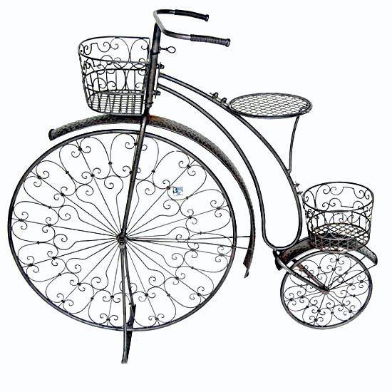 The metal plant holder boasts an antique black finish for a vintage appearance. The bicycle design allows you to place flowerpots in the baskets. This metal bicycle plant holder makes a versatile decoration for your garden.
