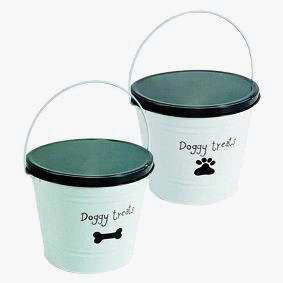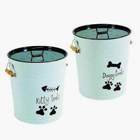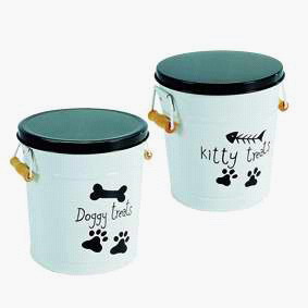 This set of pet food containers is a delight for your cuddly friends with its roomy capacity for mouthwatering meals and treats, protected by lids that feature handles. The classic construction is wrought of galvanized metal, coated in black and white to make it a comely addition to any modern household.