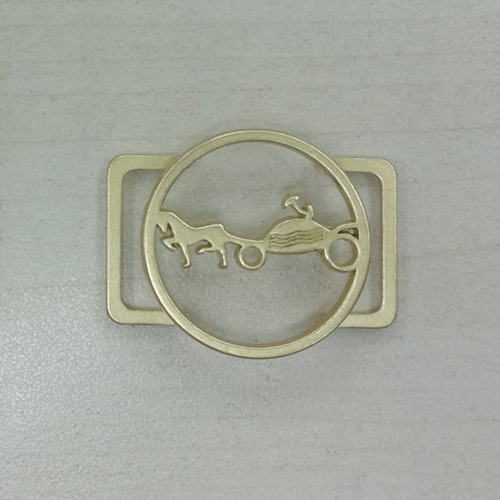 This is a metal buckle with an elegant design. It features a durable body with golden plating. This buckle is made with excellent workmanship and attention to detail.
