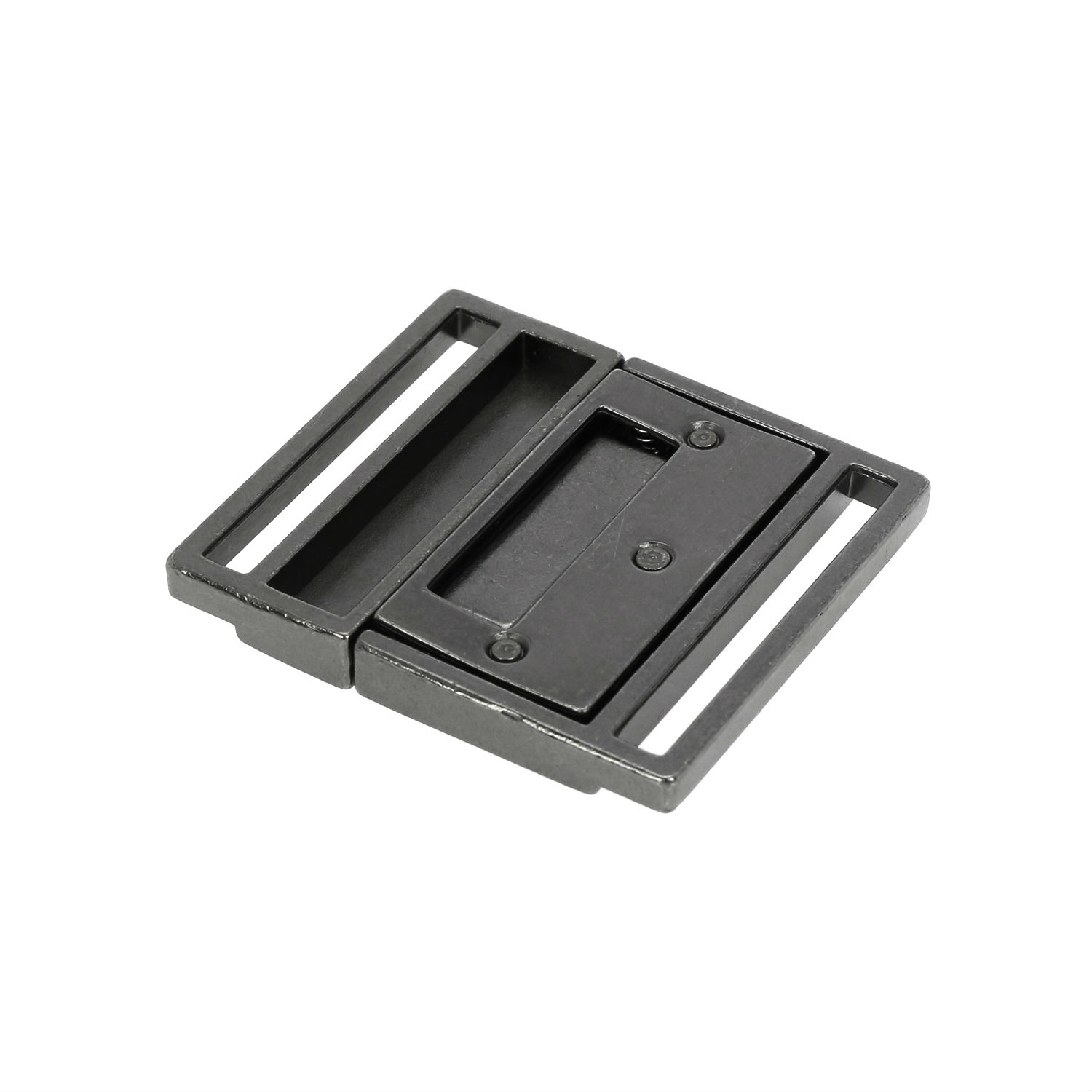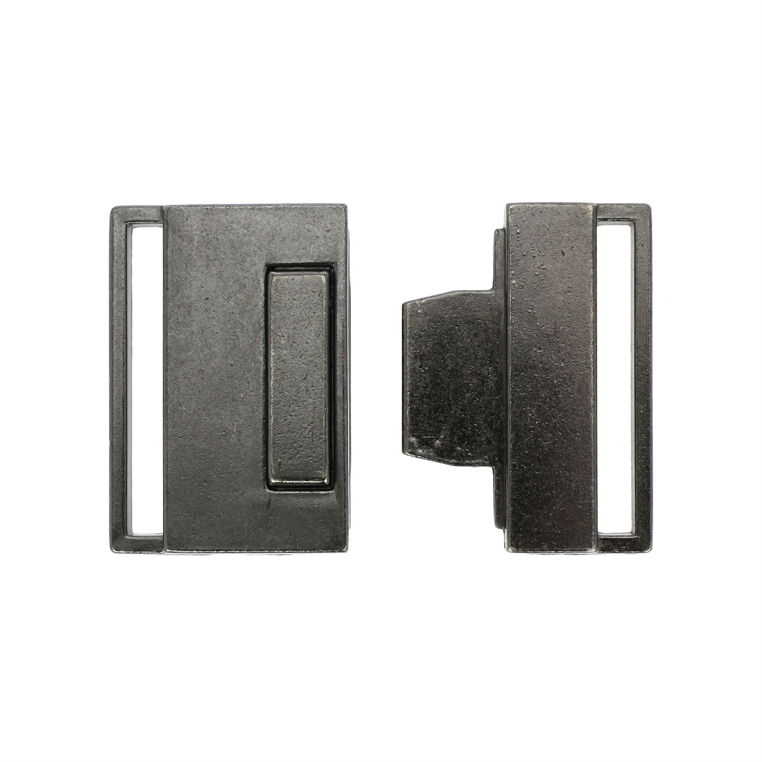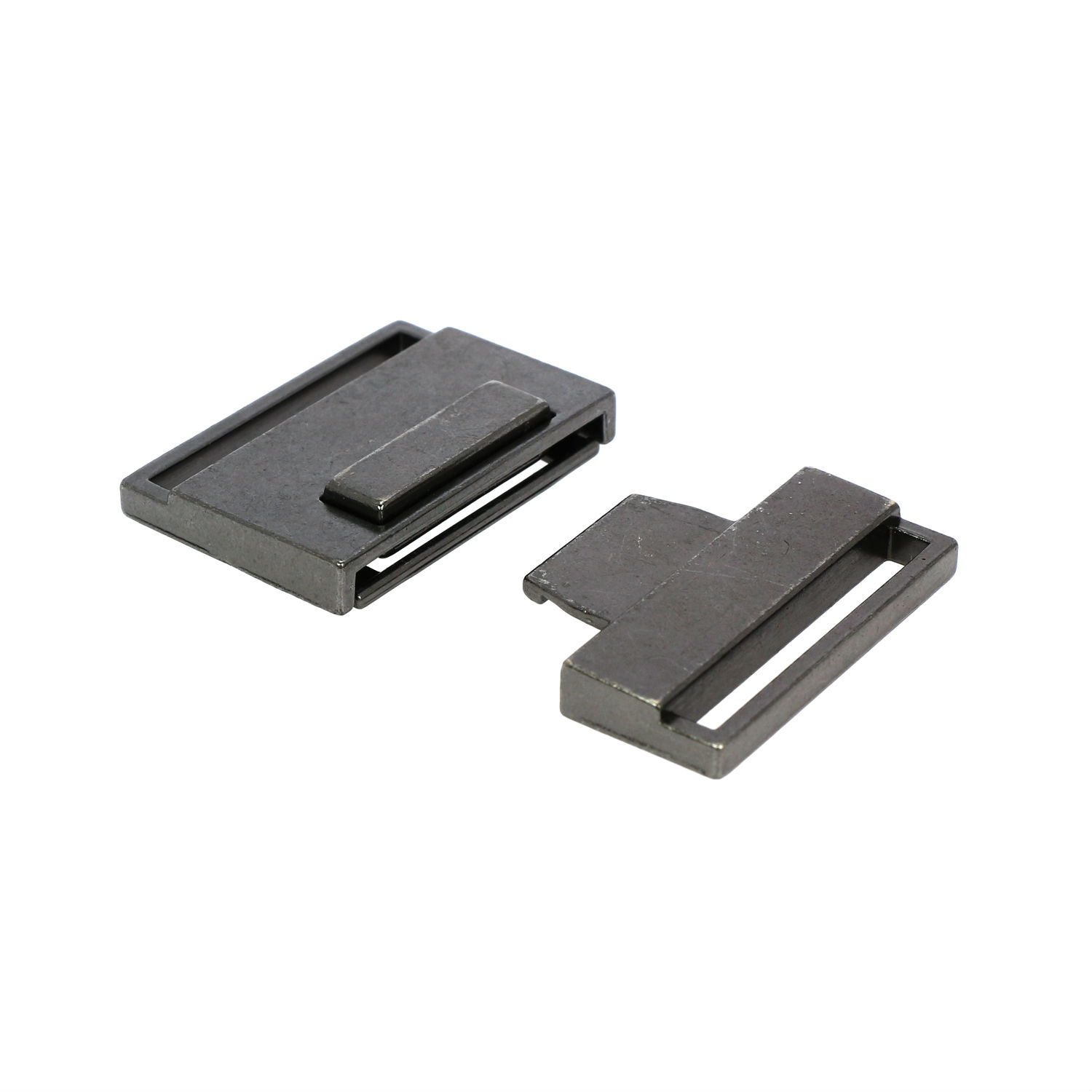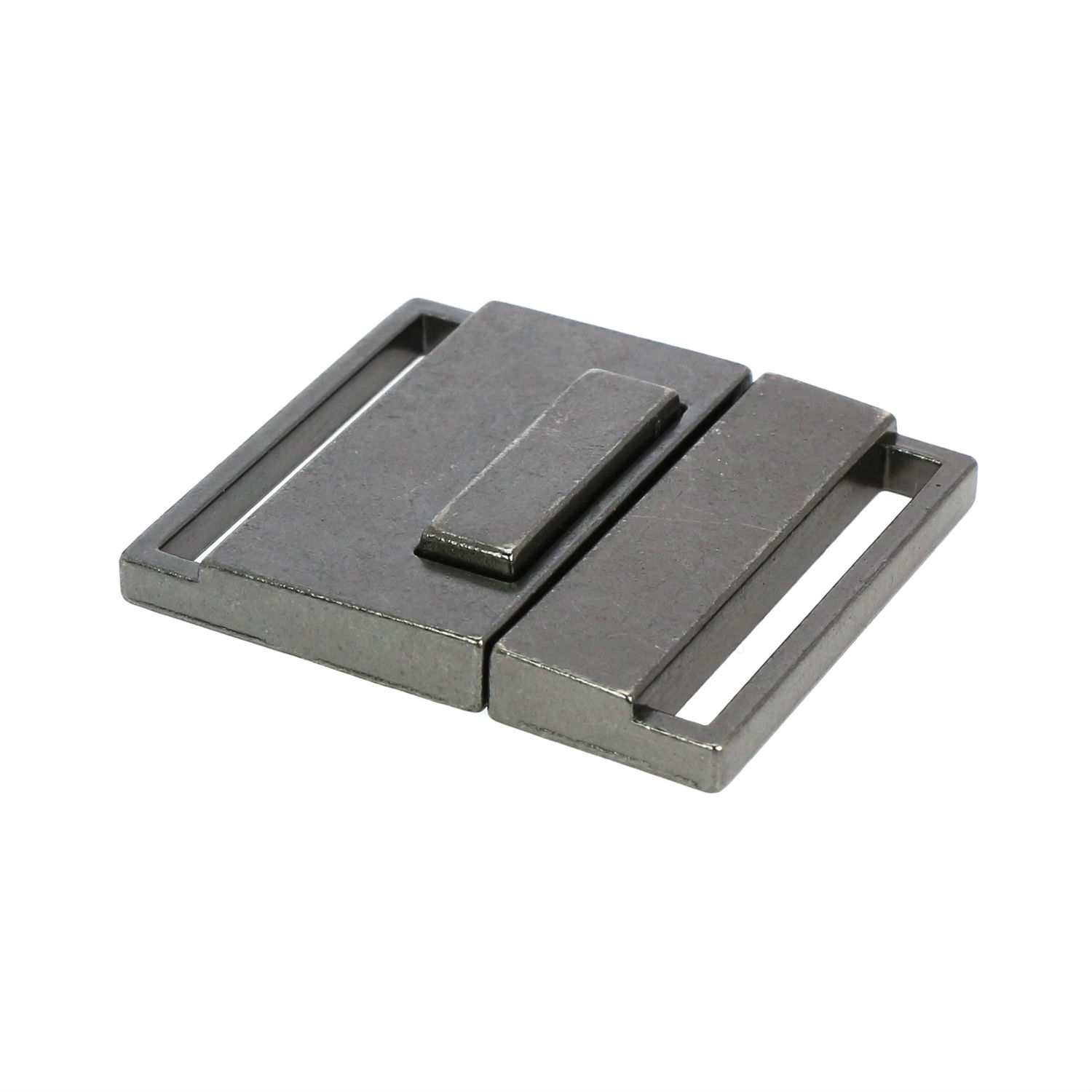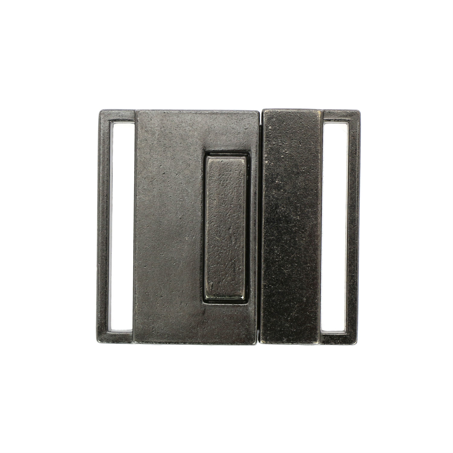 Displayed here is a two-part buckle for belt use. It is durably constructed of alloy and comes with HP plating finish to add a rugged style. This buckle has loops on the sides for belts to go through and offers secure fastening.