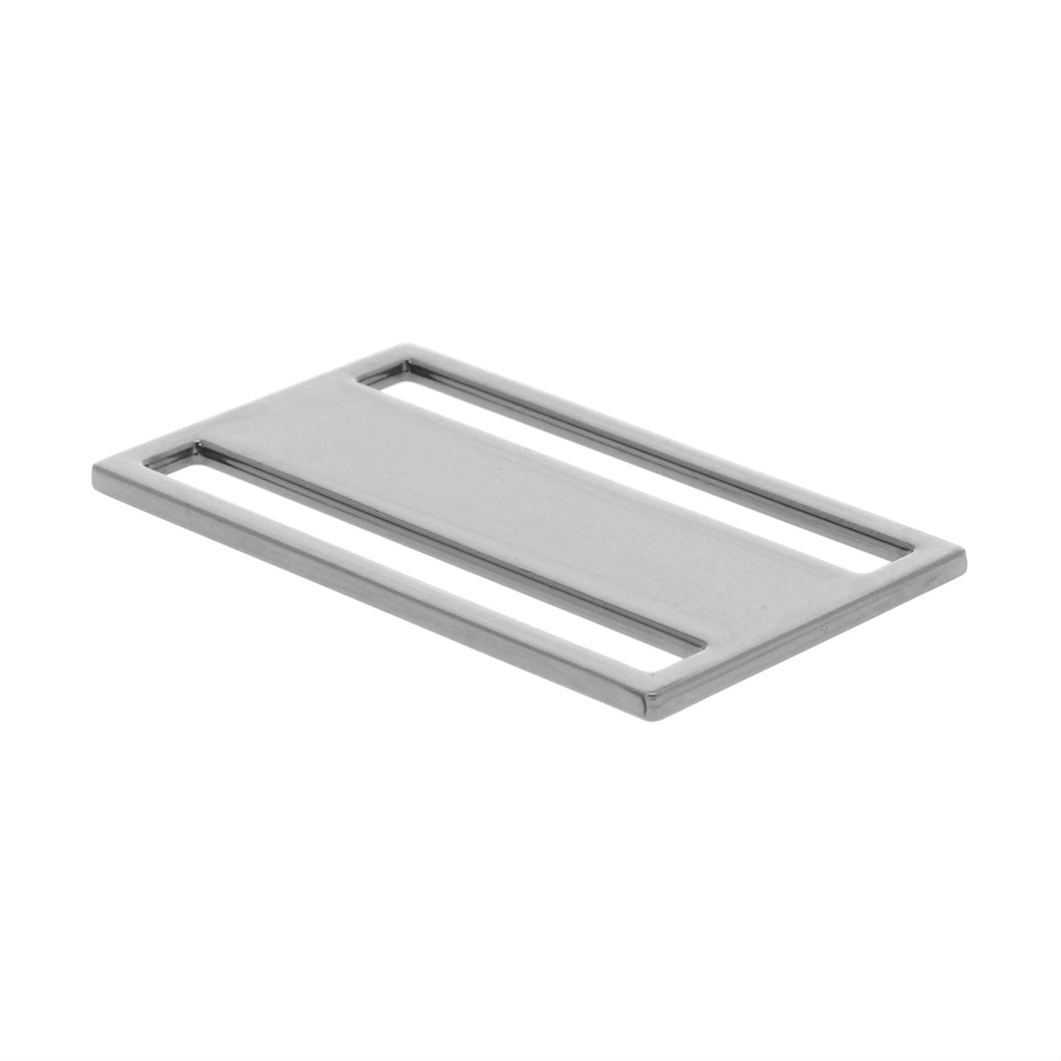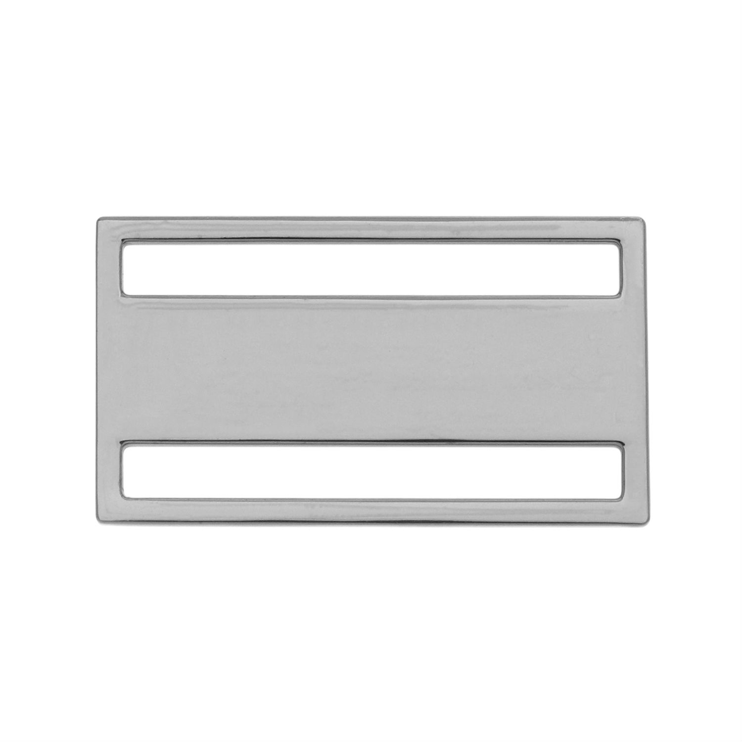 This alloy buckle comes in a flat rectangular design and has a metallic toned plated finish. It has two holes for webbing to pass through and can securely hold onto the webbing. The alloy buckle can be used to adjust the length of straps and flaunts outstanding durability.