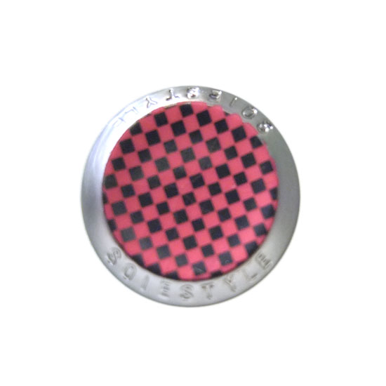 This is a metal button with pink check patterns. Made professionally, this metal button showcases fine craftsmanship. This high quality metal button is easy to apply.