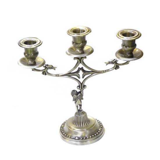 This is a metal candleholder made of zinc alloy. Featuring three arms, this candleholder showcases excellent craftsmanship. This sturdy candleholder is ideal for decoration.