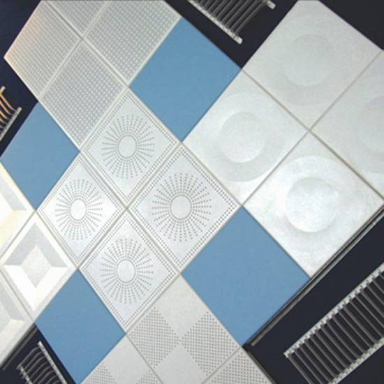 The featured products are metal ceiling panels in different colours and designs, suitable both home and office use.