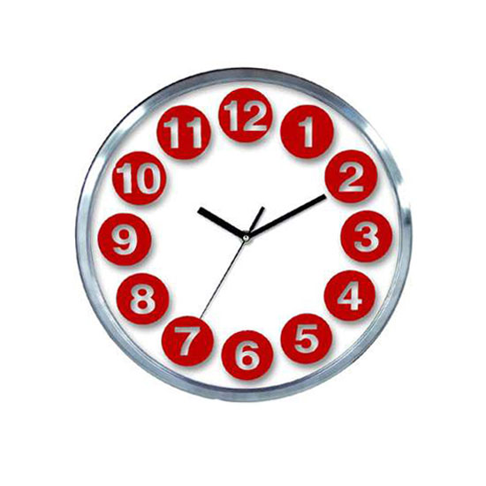 This is a metal clock with an eye-catching design. It features a white dial with Arabic numbers to indicate the hours. Each number has a red highlight for a touch of uniqueness.