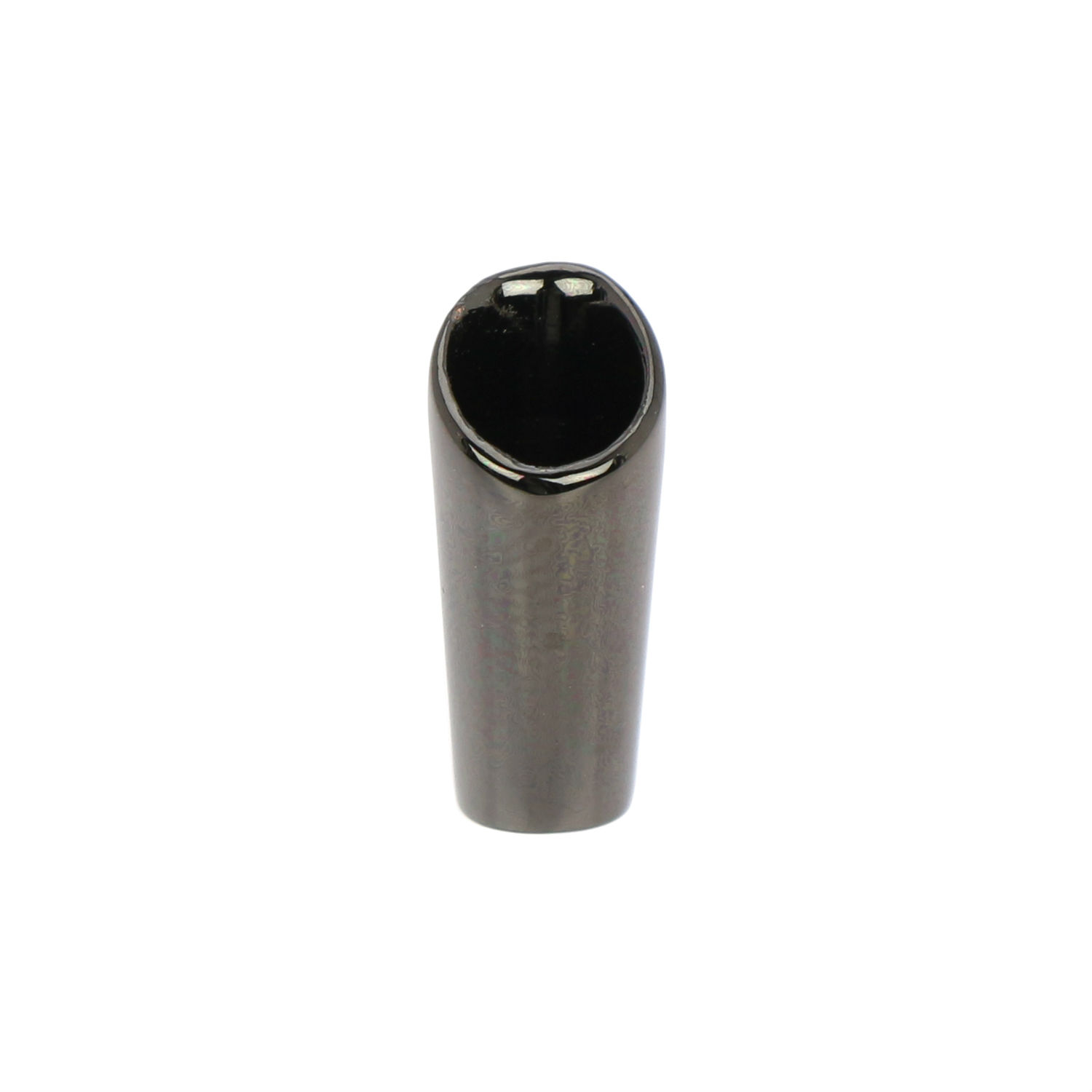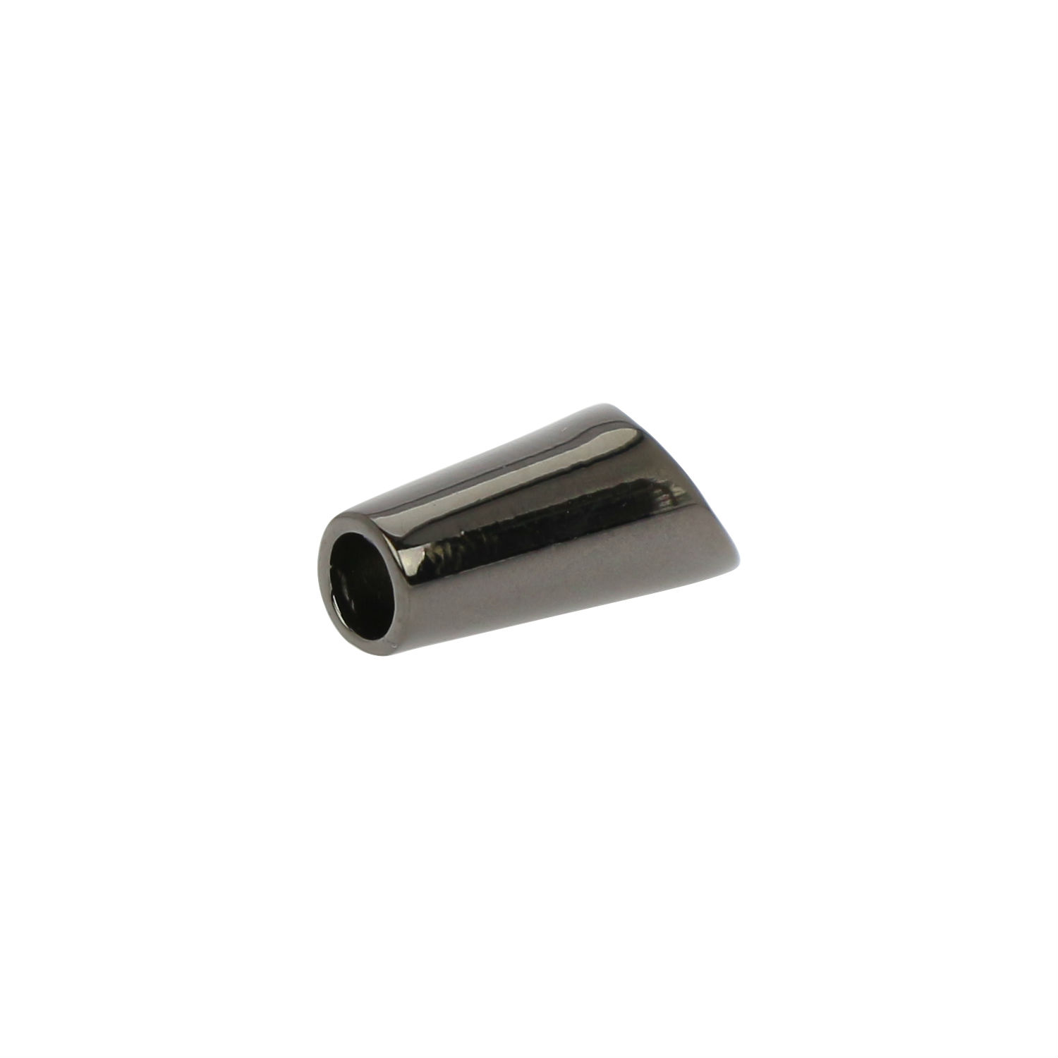 The pictured metal cord end cap comes in a cylindrical shape and has a slanted top. It has a wide opening for easy cord insertion and is suitable for using with different kinds of cords and drawstrings. This cord end cap flaunts superior quality and is excellent for decorative applications.