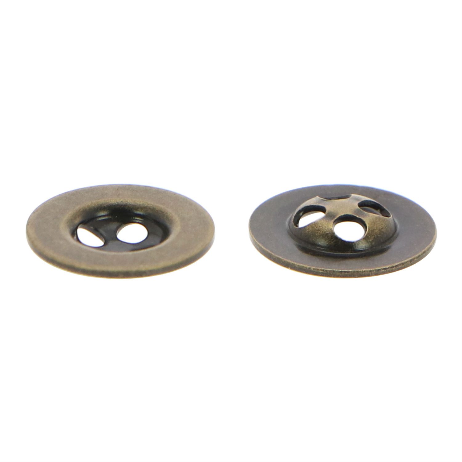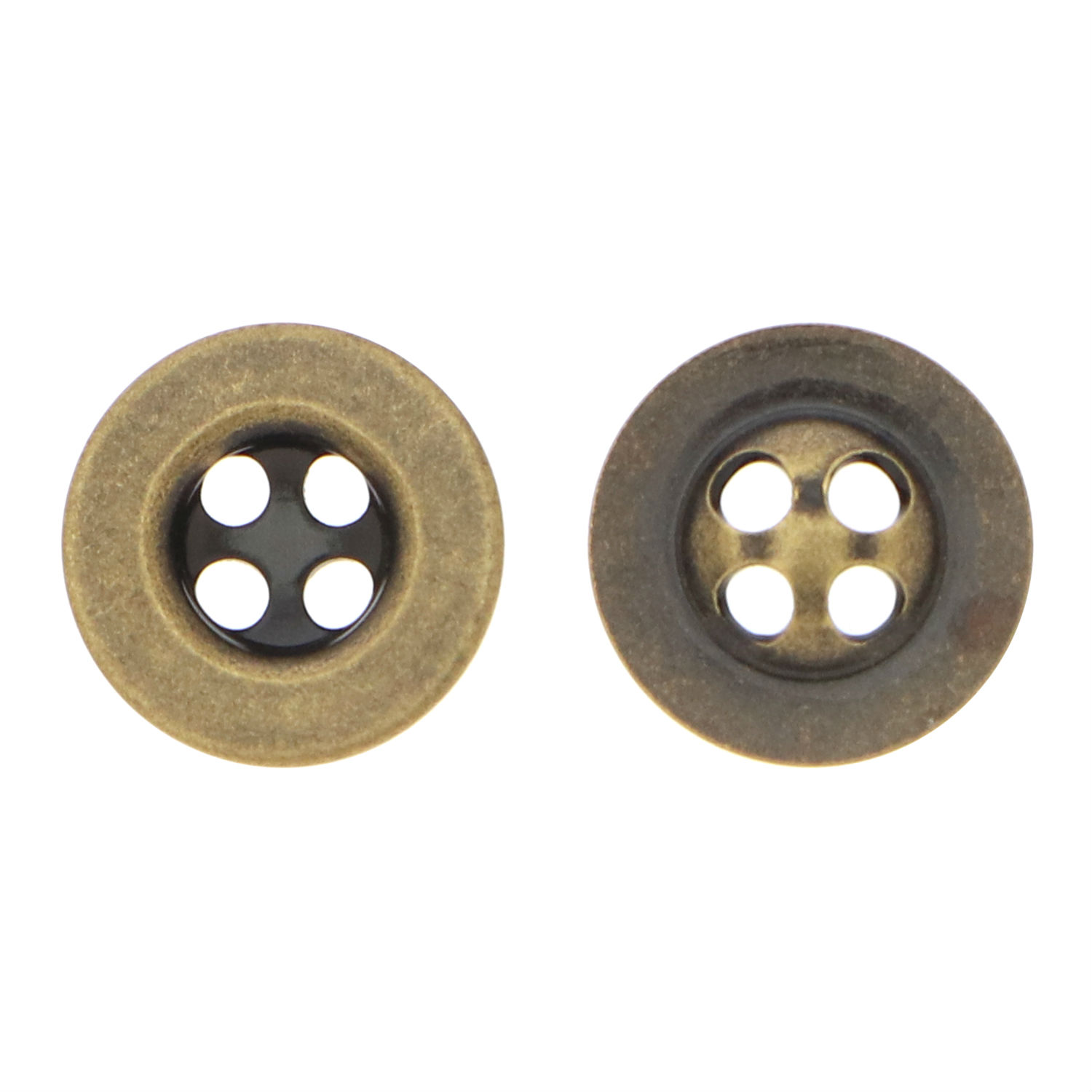 Opt for this four-hole flat button for the upcoming garment production project. Looking gorgeous with a frayed surface, the vintage-themed button features a metallic colorway and it is trimmed with a thick border to express a note of classiness. Ensuring secure fastening with four cut-out holes, it can be applied on a wide range of fabrics.