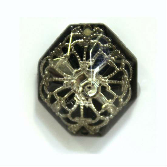 This resin bead features metal injection that forms an intricate pattern in the center front. It comes in the shape of an octagon and dazzles with its glossy appearance. This resin bead will make a stunning ornament for garments, handbags, shoes and etc.