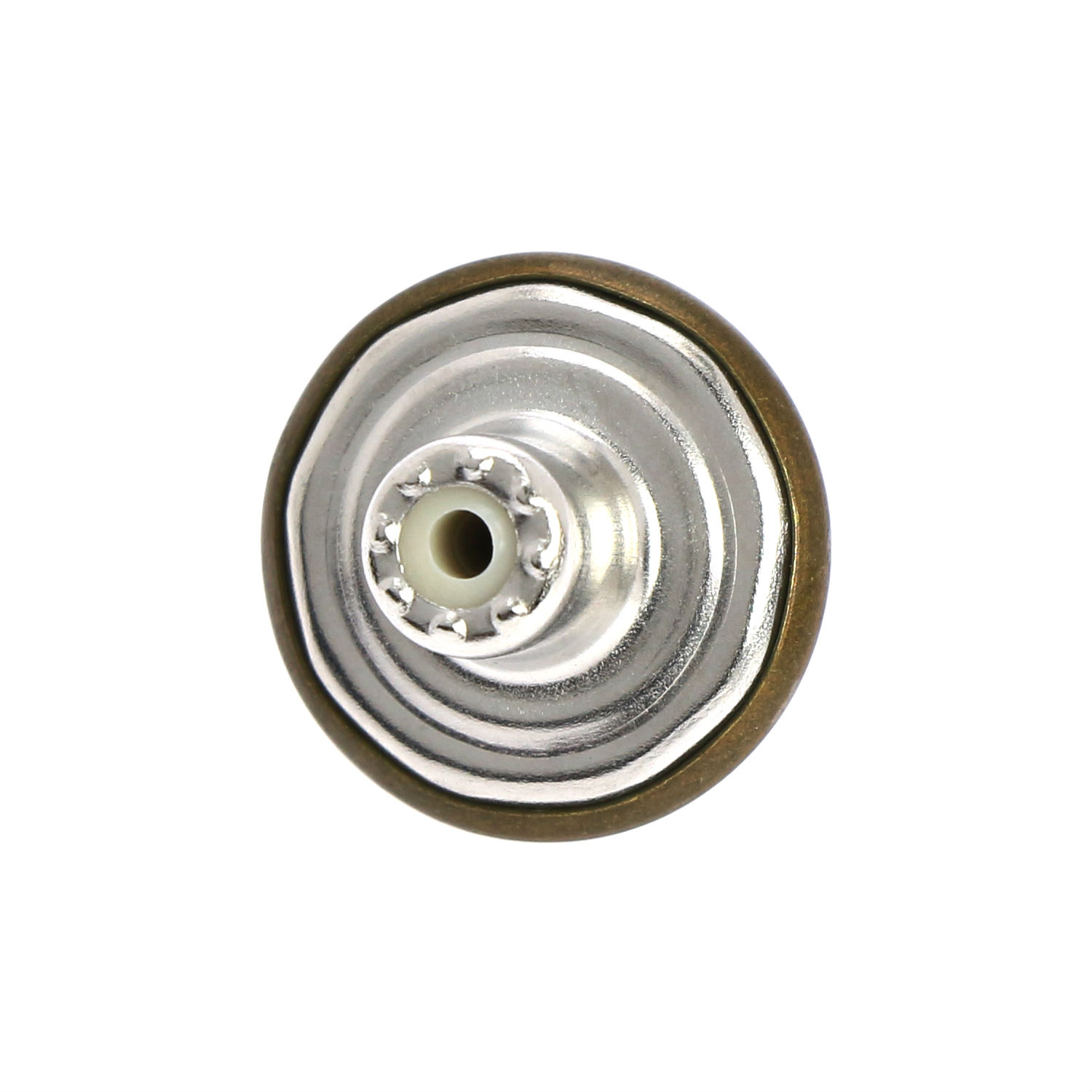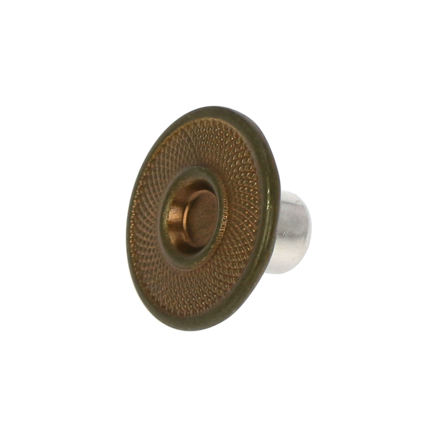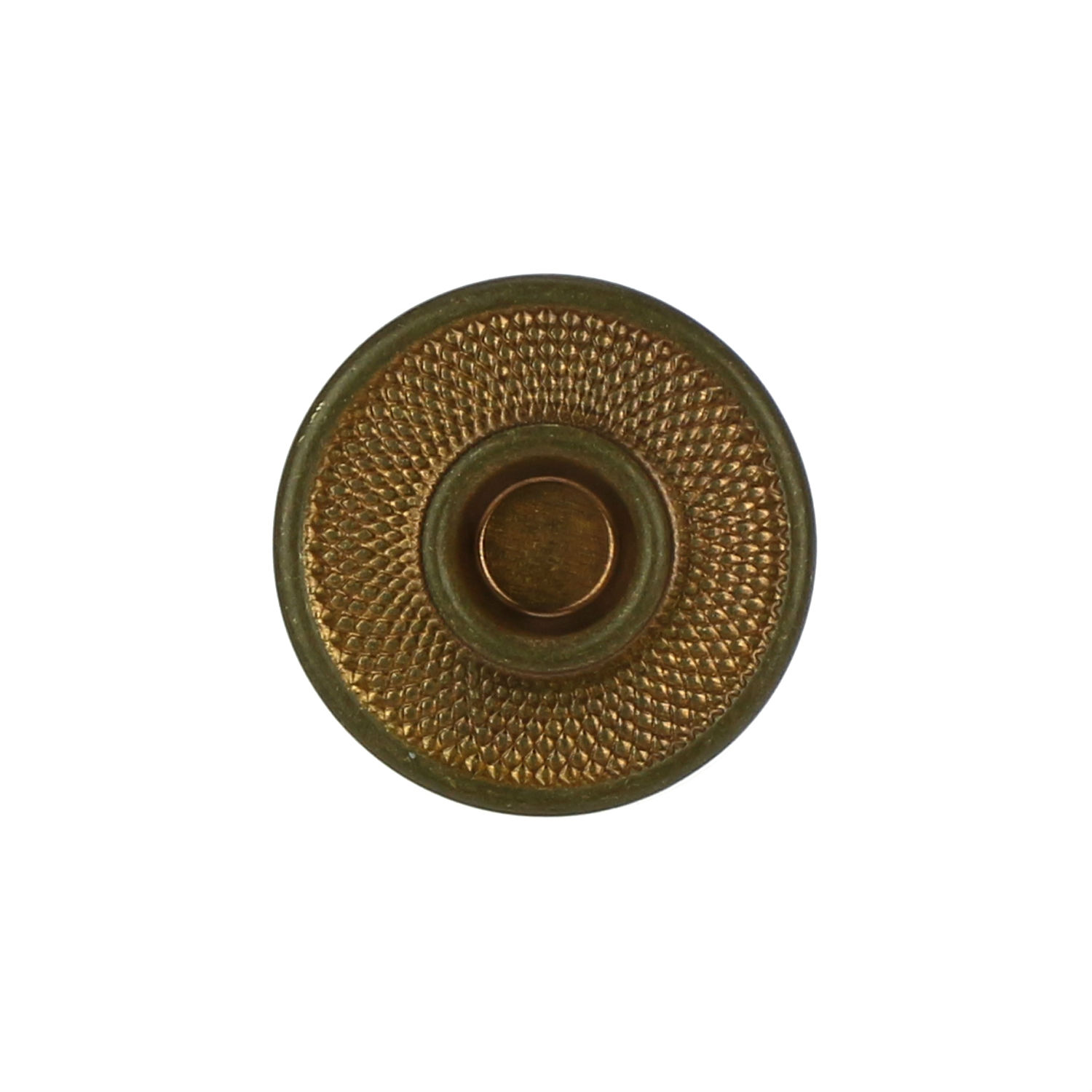 The displayed jeans button is made of brass and has a plated finish. It comes in a round shape and has a textured exterior to offer a good touch. This jeans button is easy to work with and will look great on any jeans.