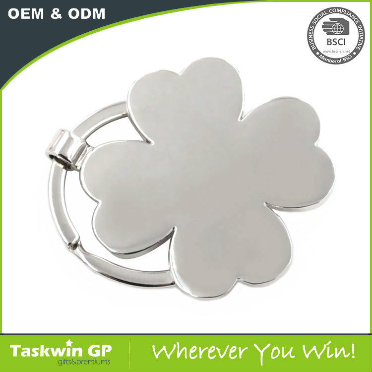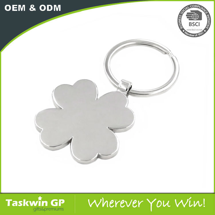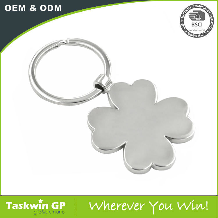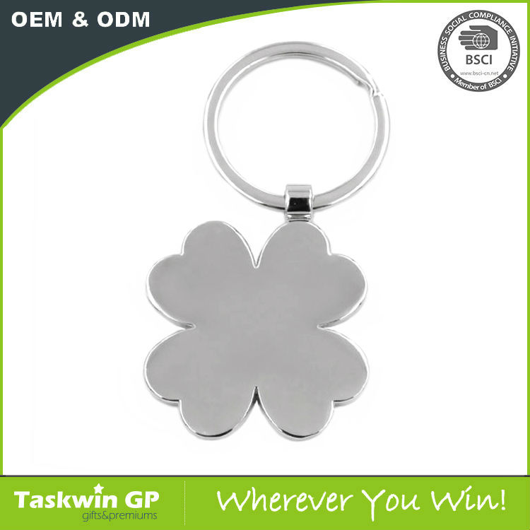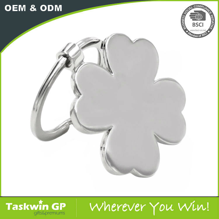 This keychain features a four leaf clover design and has shiny metallic exterior. It has a round split ring and can be attached to keys to keep them organized. The keychain flaunts a high quality and is excellent for promotional use.