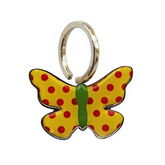 This is a dainty keychain with a unique design. It features a butterfly embellishment in brilliant colors. This keychain has a durable metal structure for long-lasting use.