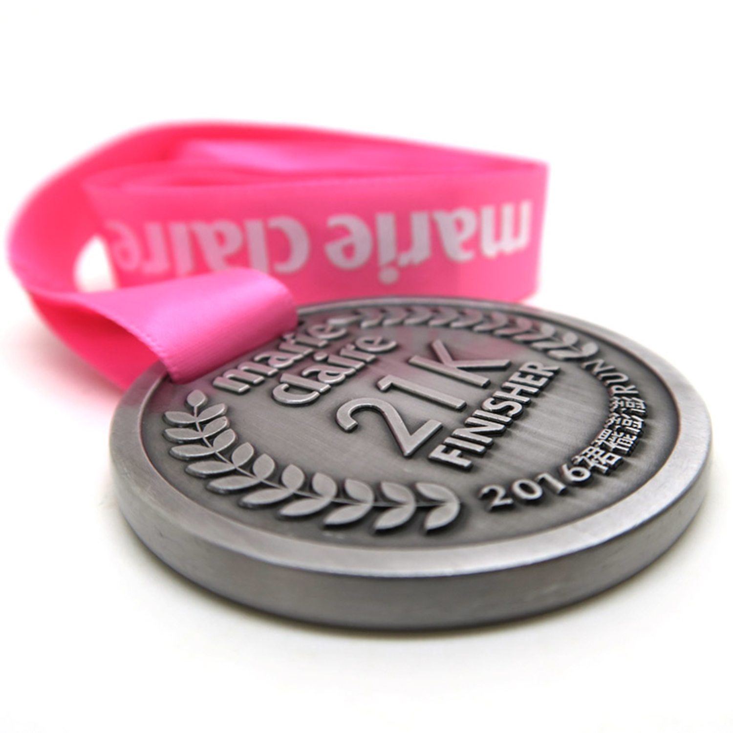 Pink Run Event started in 2014, the event is trying to increase the awareness of breast cancer since it has been a long time on the top one cancer for Taiwanese women. This 21K finisher award medal is made of zinc alloy with soft enamel color filled on one side, antique zinc finishing and with pink ribbon attached, it is high quality marathon medals for all the participants.