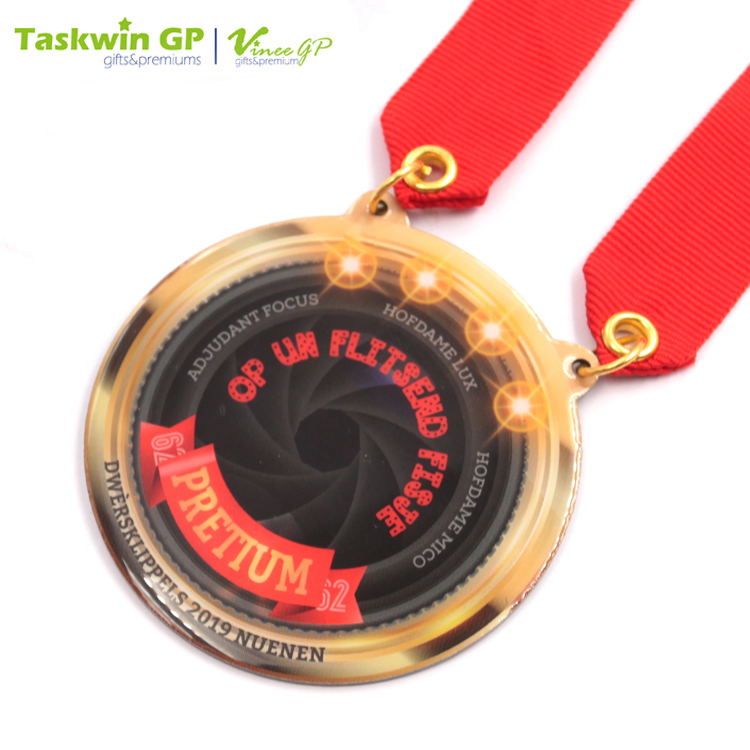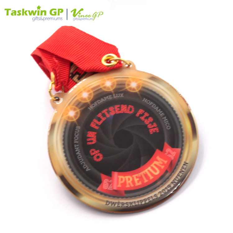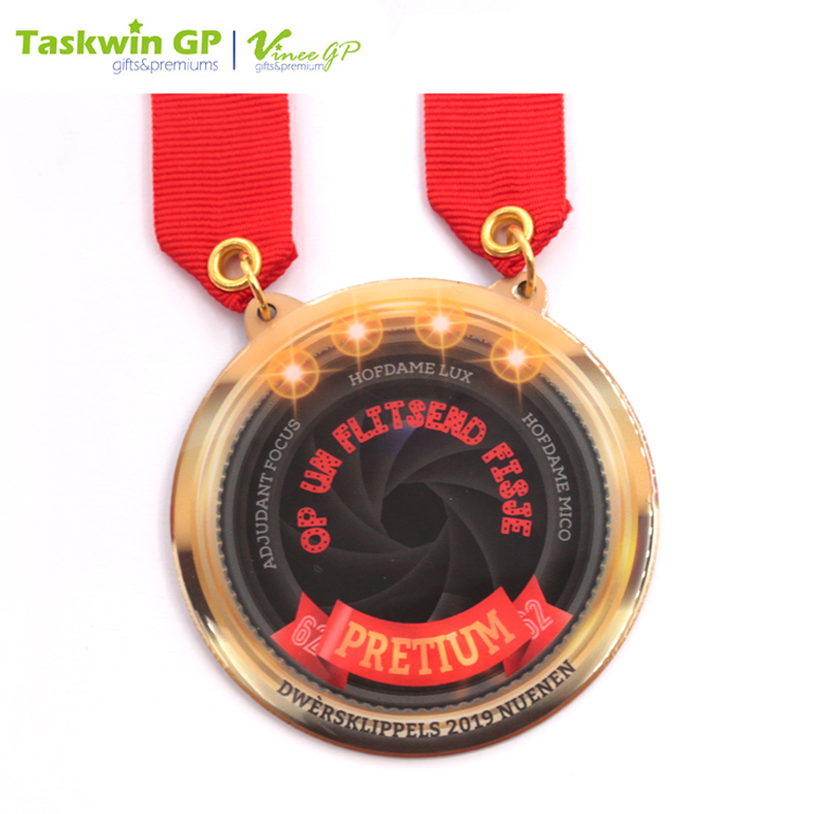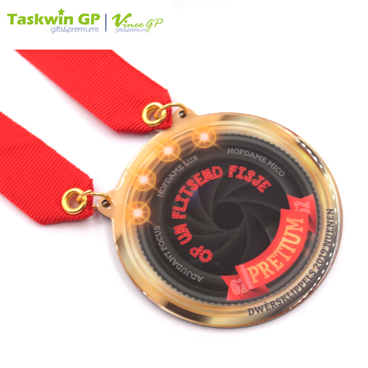 - Metal medal bundled with a matching neck ribbon.
