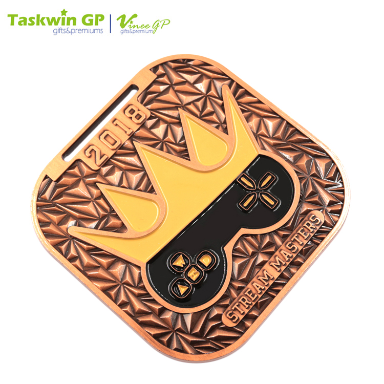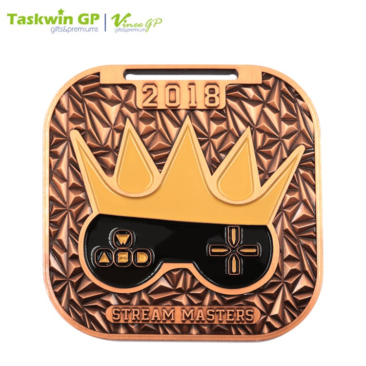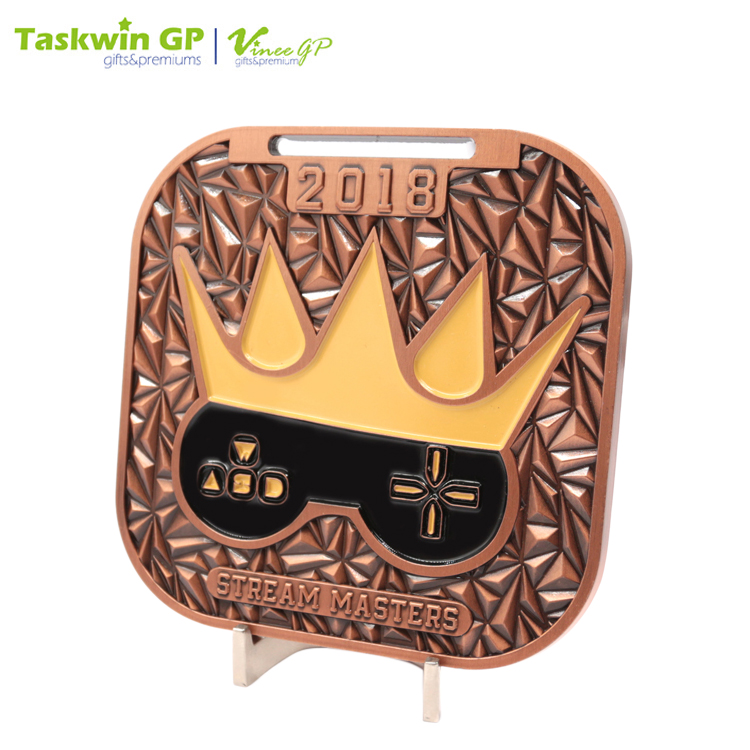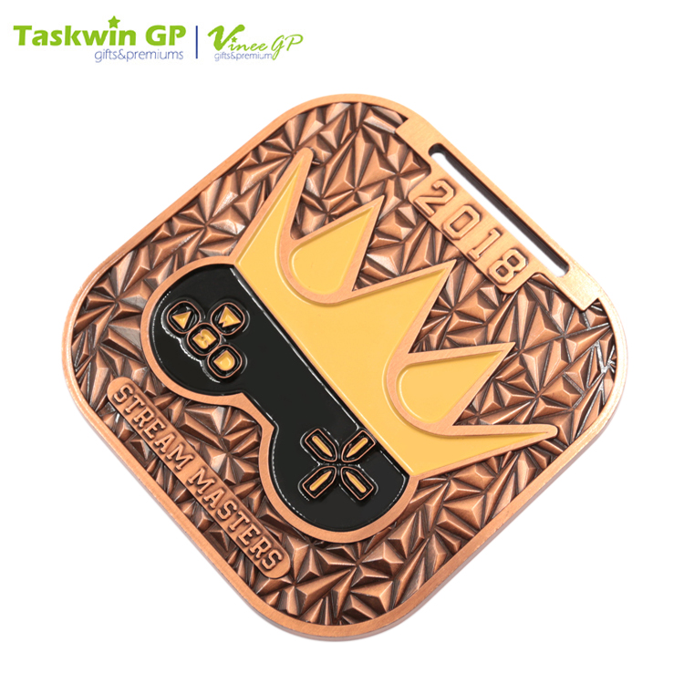 This medallion is made of die-cast zinc alloy and has antique copper plating. It comes in a square shape and is available in your own designs. The medallion has a loop on top for attaching to ribbons and is excellent as a promotional gift or an award for events.