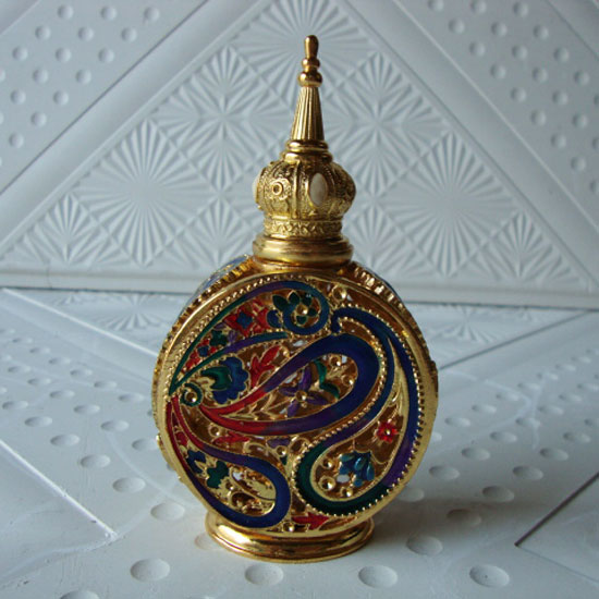This gold metal perfume bottle comes with a cylinder body beautifully accentuated by a colorful, tribal, floral pattern and a delicate crown. The textured surface of the bottle shows exquisite craftsmanship. This unique metal bottle combines elegance with a vintage, antique style, and is a stylish bottle for your fragrance or body mist.