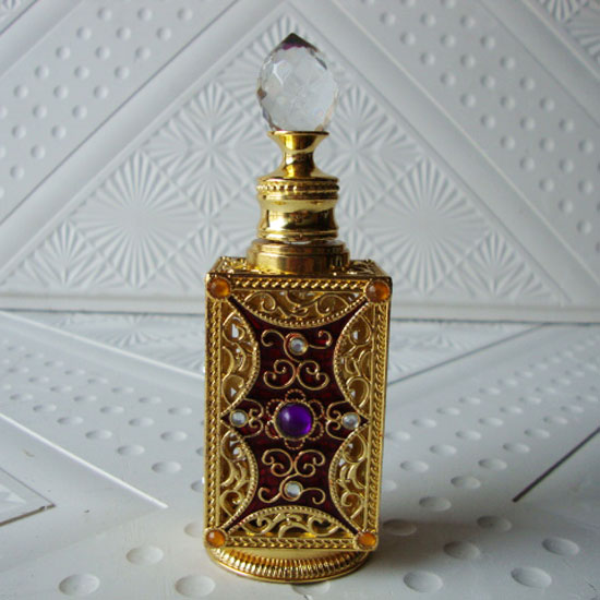 This perfume bottle comes with a delicate cuboid body beautifully carved with geometric patterns and decorated by colored glass details. Set on the top of the cap is an olive-shaped glass ornament, which makes the bottle stand above traditional glass perfume bottles. Display this glamorous bottle on your desk or keep it in your handbag to show your own distinctive style.