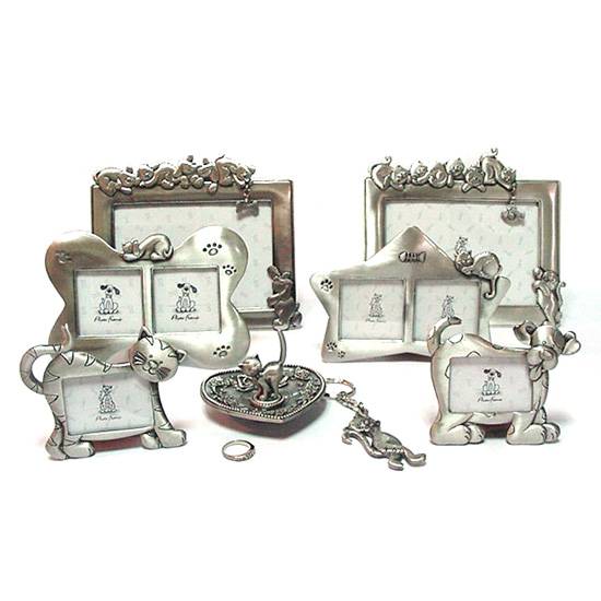The theme of the photo frame is pets. The photo frame is made of metal. The photo frame has back supported.