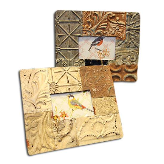 These are two metal photo frames for home and interior decorations. Suitable to be hung on wall or put on table, they are featured with different artistic embossed patterns formed by scrolls and curves.