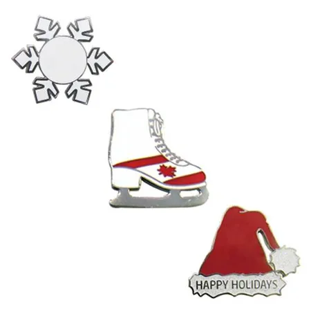 These metal pins make ideal advertising premiums. They can be made into various shapes and images, such as snowflakes, skates and Santa hats to suit your promotion needs. Wordings can also be printed on the metal pins to complement your pins.
