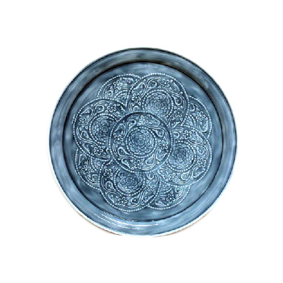 This round metal plate features layered plate patterns with floral details. It is accentuated with a ceramic look finish for added appeal. This artistic metal plate is ideal for home decoration.
