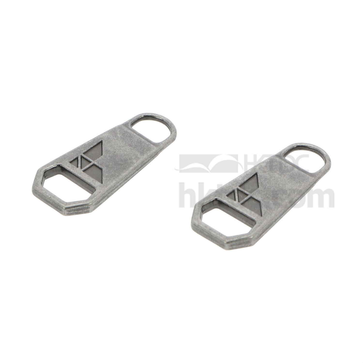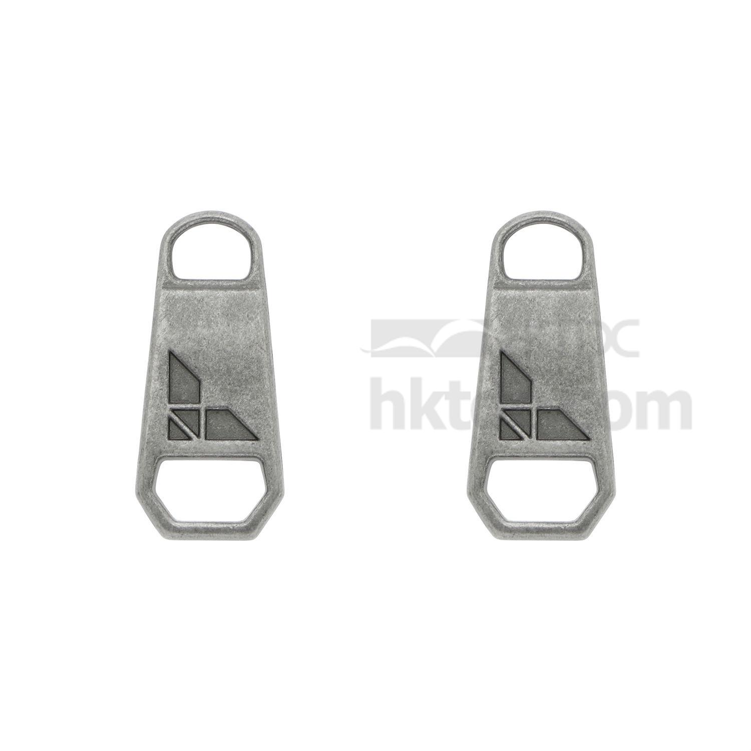 Show your logo on the zippers of bags, jackets, dresses and more with this alloy zip pull. It is a robust alloy construction with plated finish and is engraved with a logo on the exterior. This alloy zip pull has loops for attaching to zippers and is great for repair and replacement use.