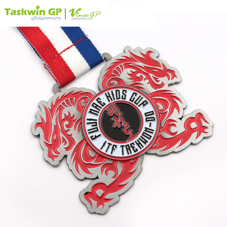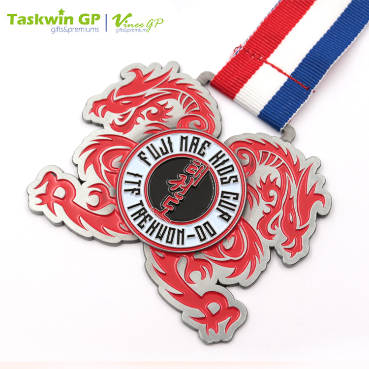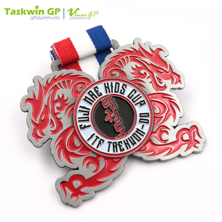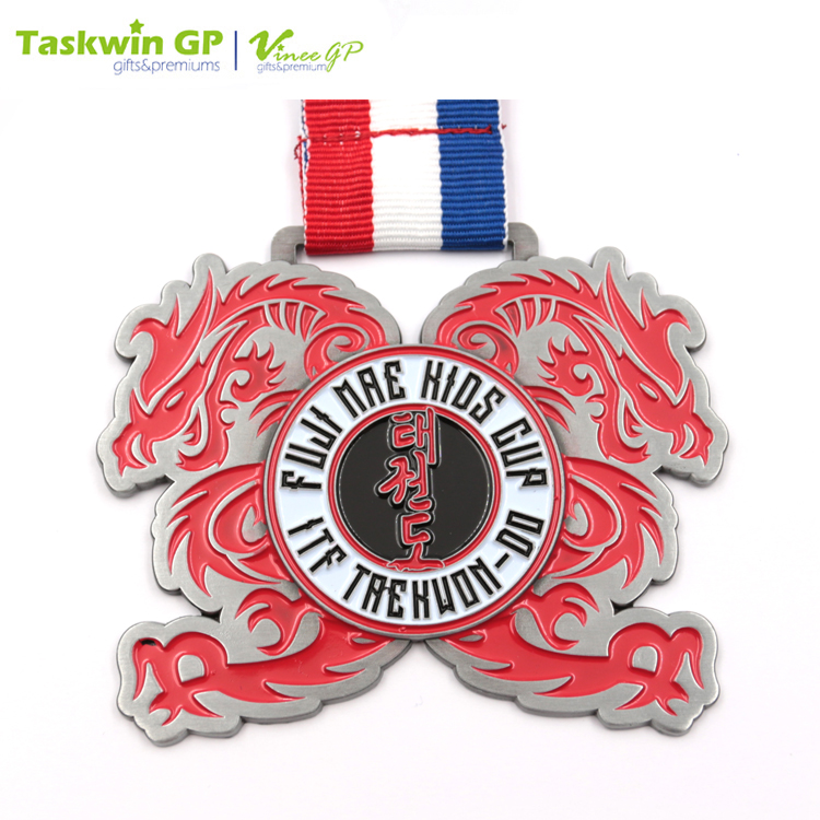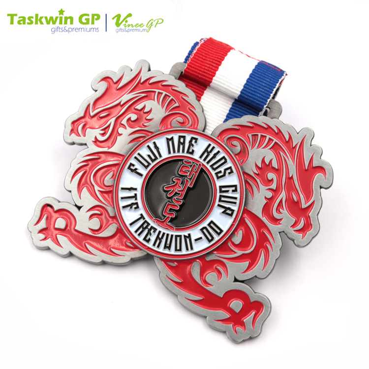 Made of die-cast zinc alloy, this medal flaunts a high durability and is great for using as a gift. It shows the name of the events in the center and is decorated with two dragons on the side. This zinc ally medal has a neck ribbon for wearing and is suitable for racing and sports competitions.