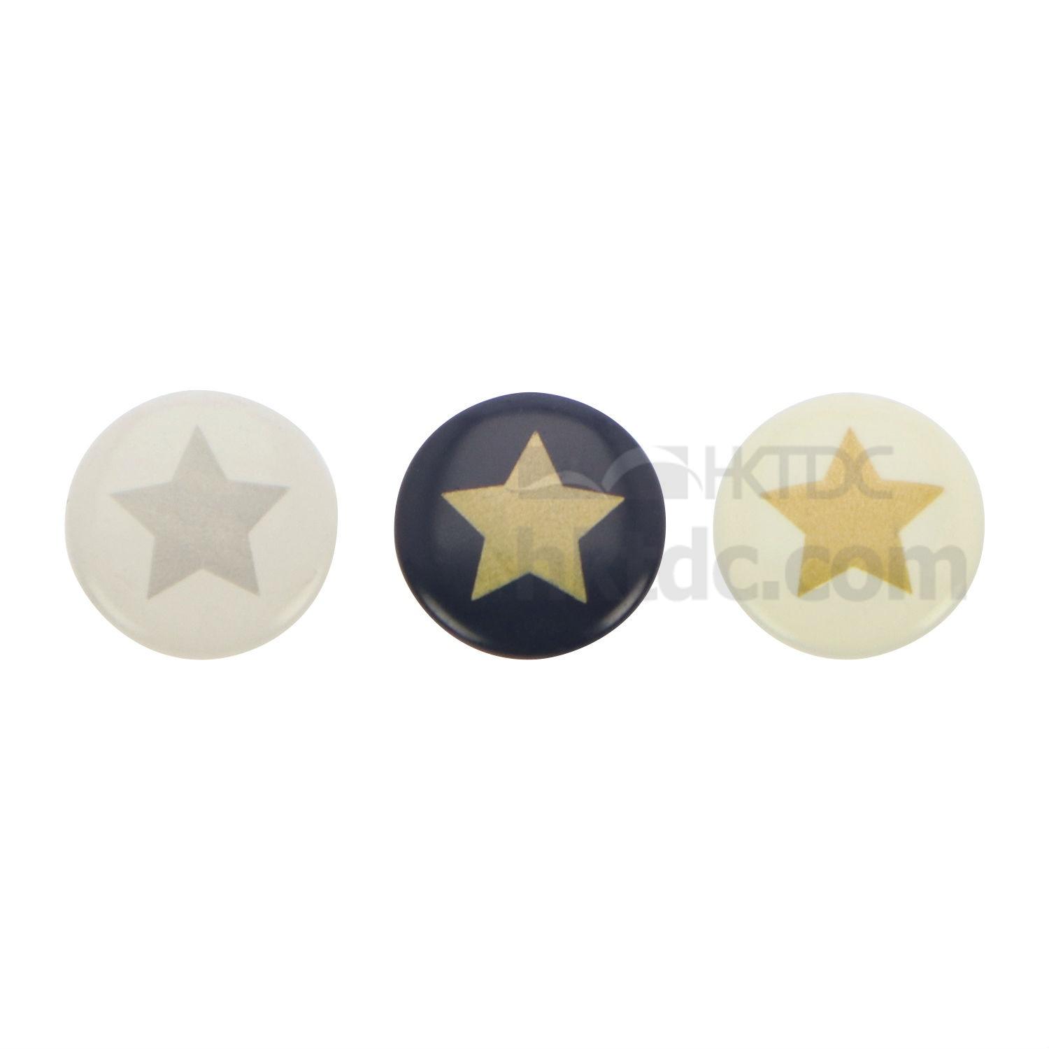 This brass button is round shaped and is decorated with a star on the surface. It comes with enamel finish for a glossy look and has five prongs at the back for installation. The brass button is excellent for decoration use and is available in different colors.