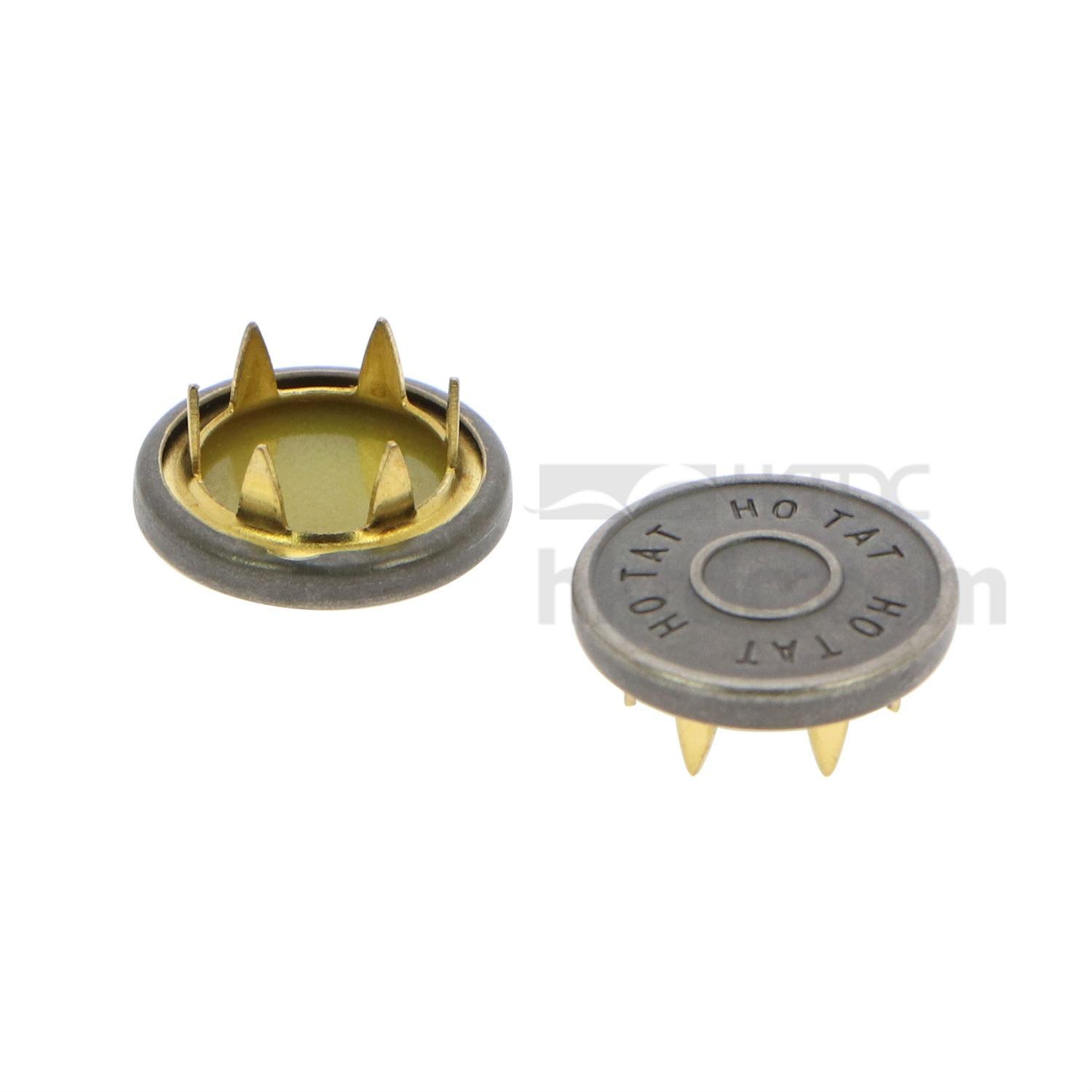Brand your products in a stylish way by using this brass button. It offers a rugged look with a plated finish and is engraved with brand names on the surface. This brass button has six prongs for installation and is suitable for a wide variety of products.