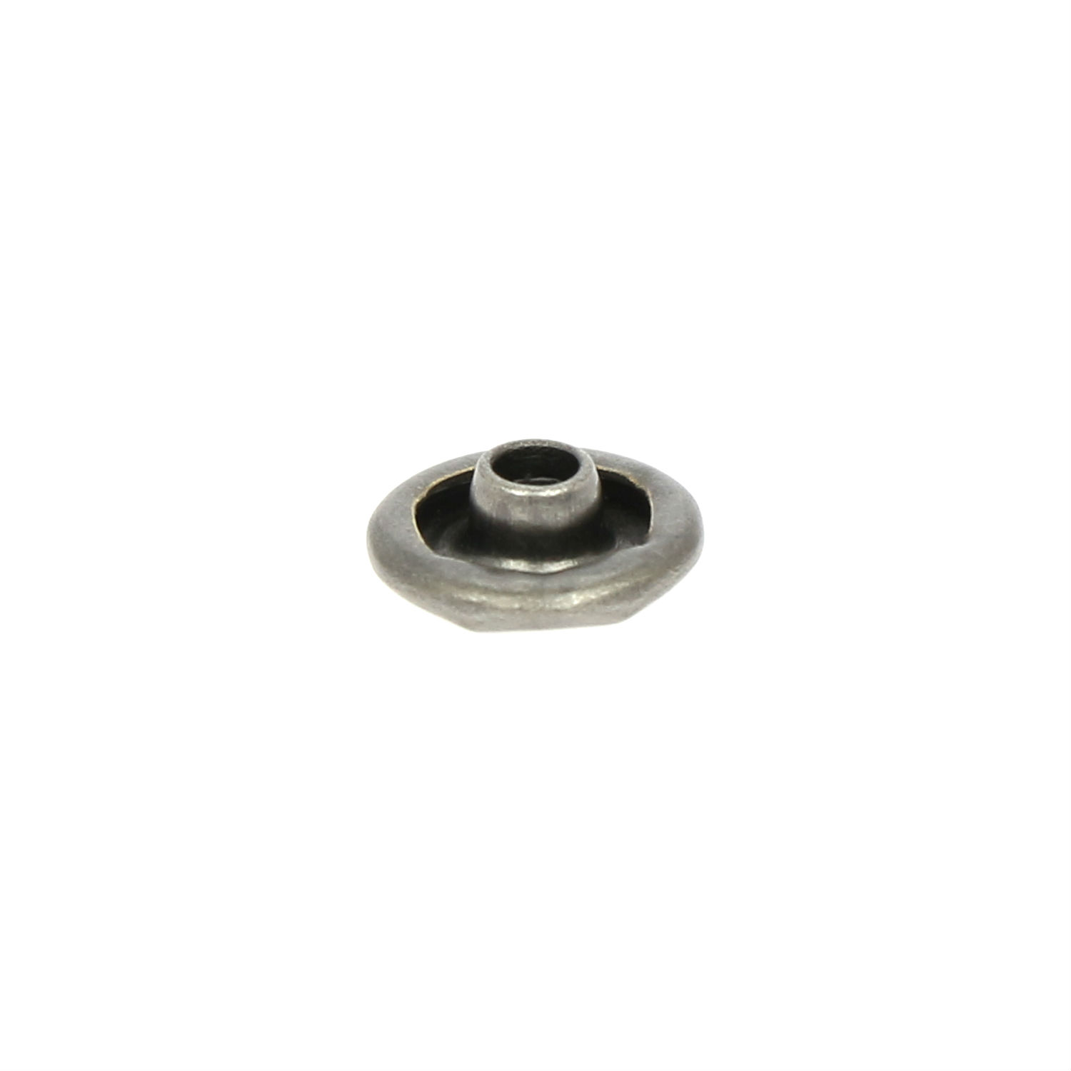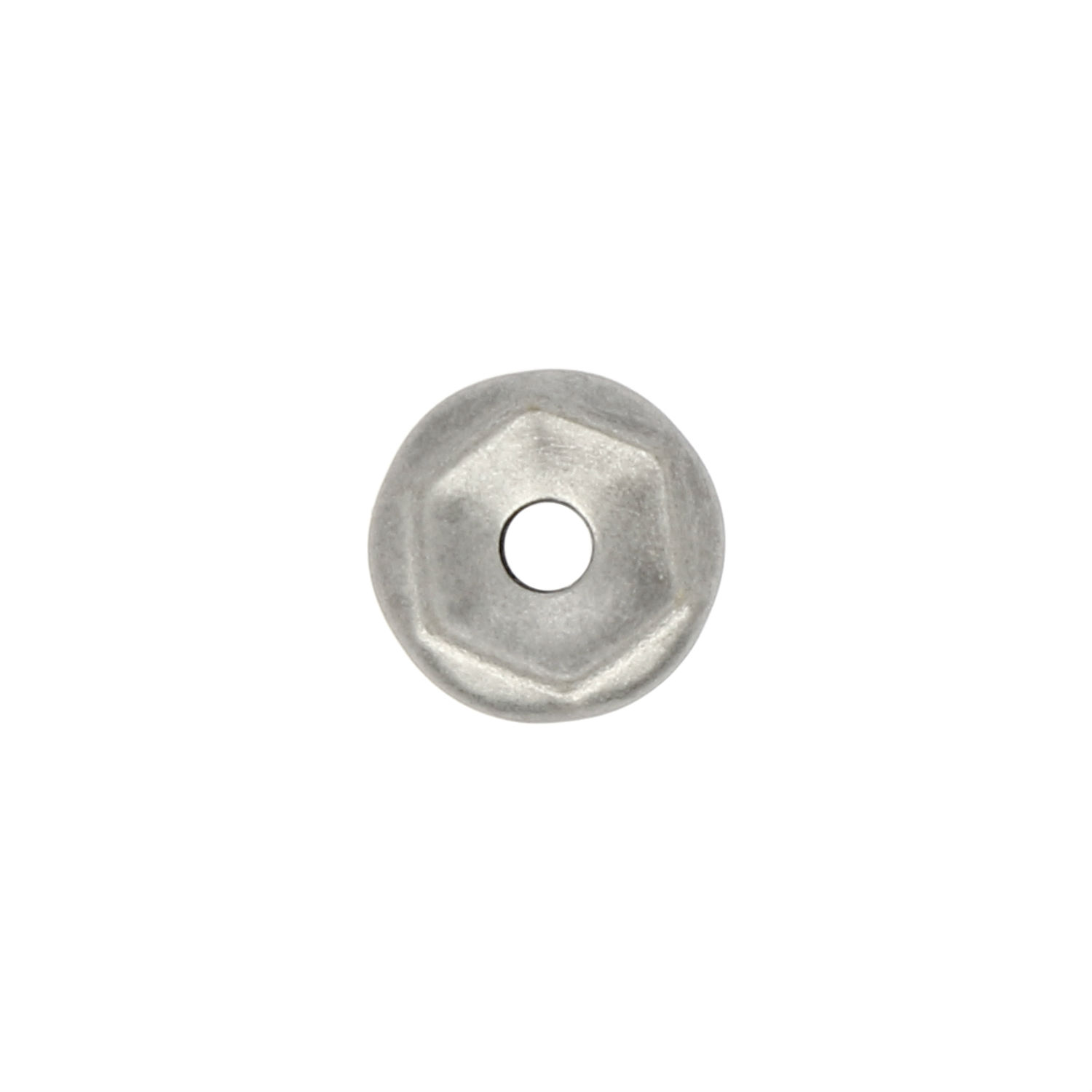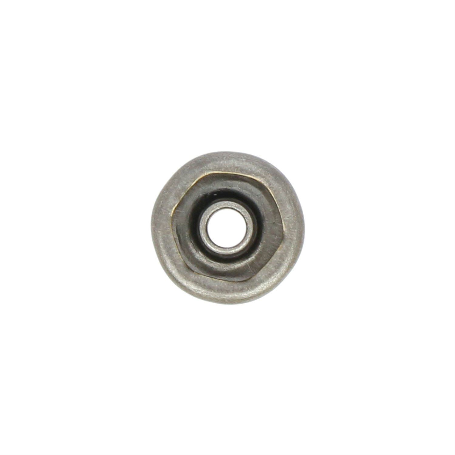 This brass rivet comes in a round shape and features a plated finish. It is adorned with a hexagonal pattern and has a hole in the center. The rivet flaunts a high durability and is perfect for decorating garments and handbags.