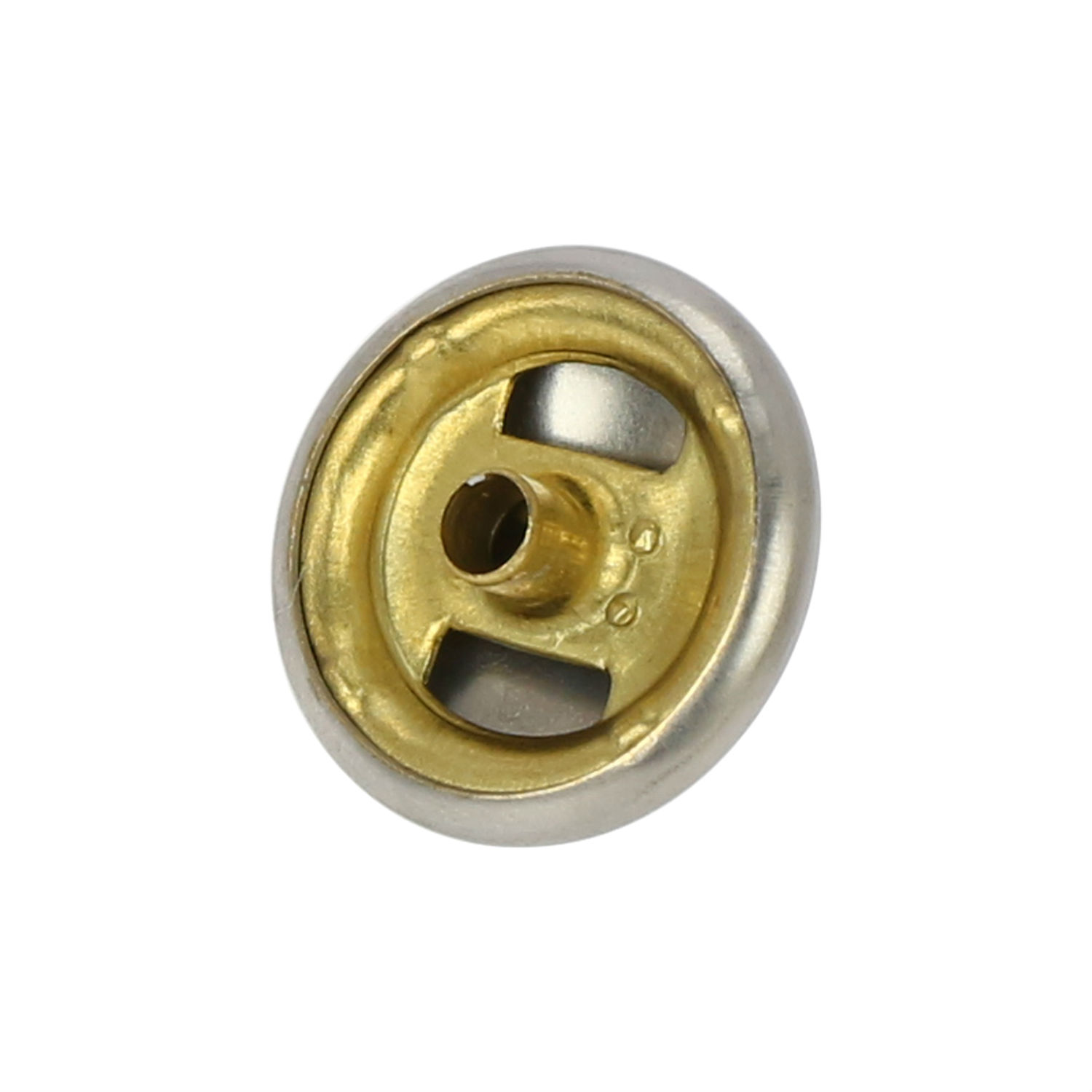 Securely fasten clothing and bags with this brass snap button. It comes in a round shape and has a plated exterior in a metallic tone. This snap button flaunts a high durability and is suitable for replacement and repair use.