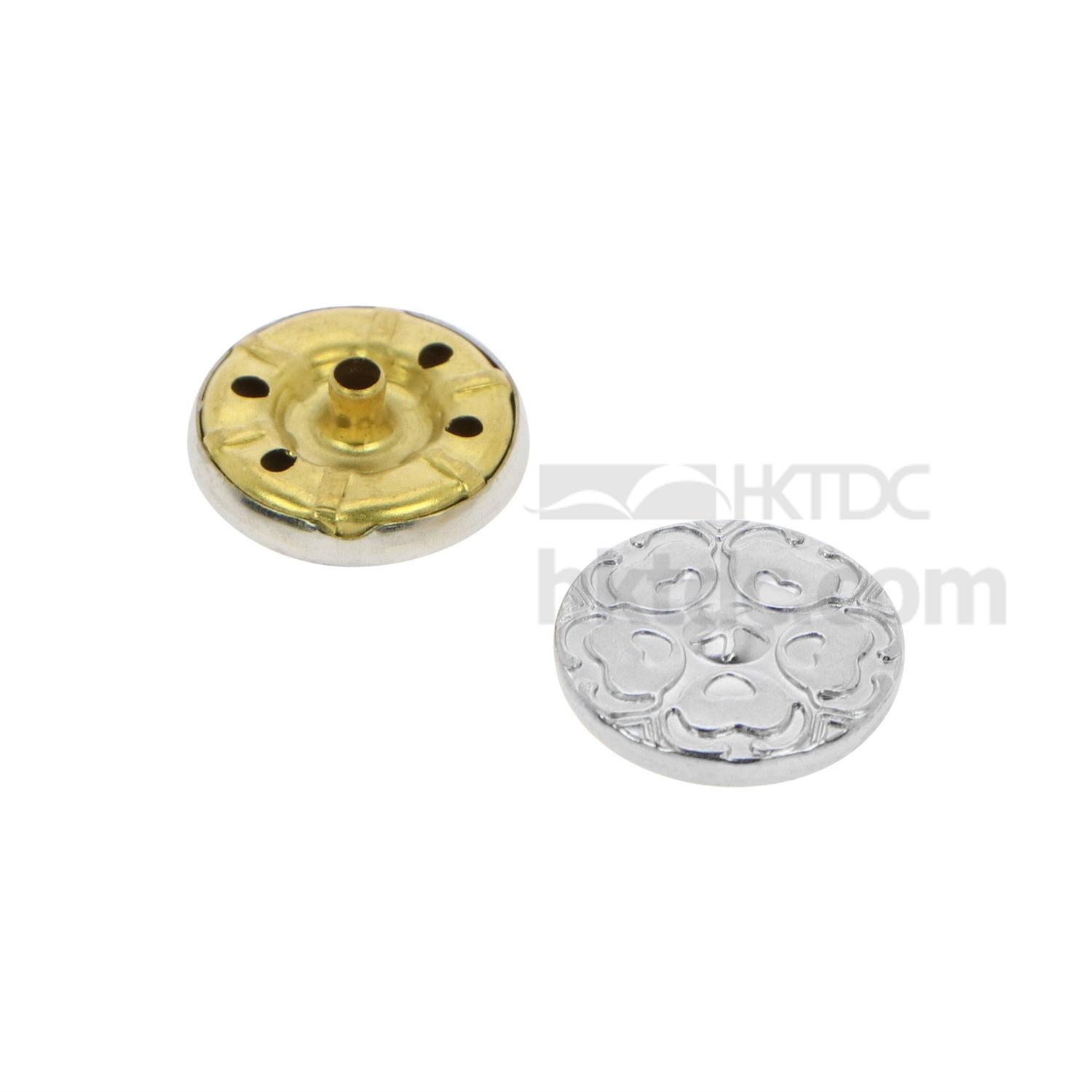 This brass snap button comes in a round shape and has a shiny plated surface in silver tone. It features the design of a five-pedal flower and has a post at the back for attaching to fabrics. Flaunting a durable and elegant design, this snap button is great for both fastening and decoration use.