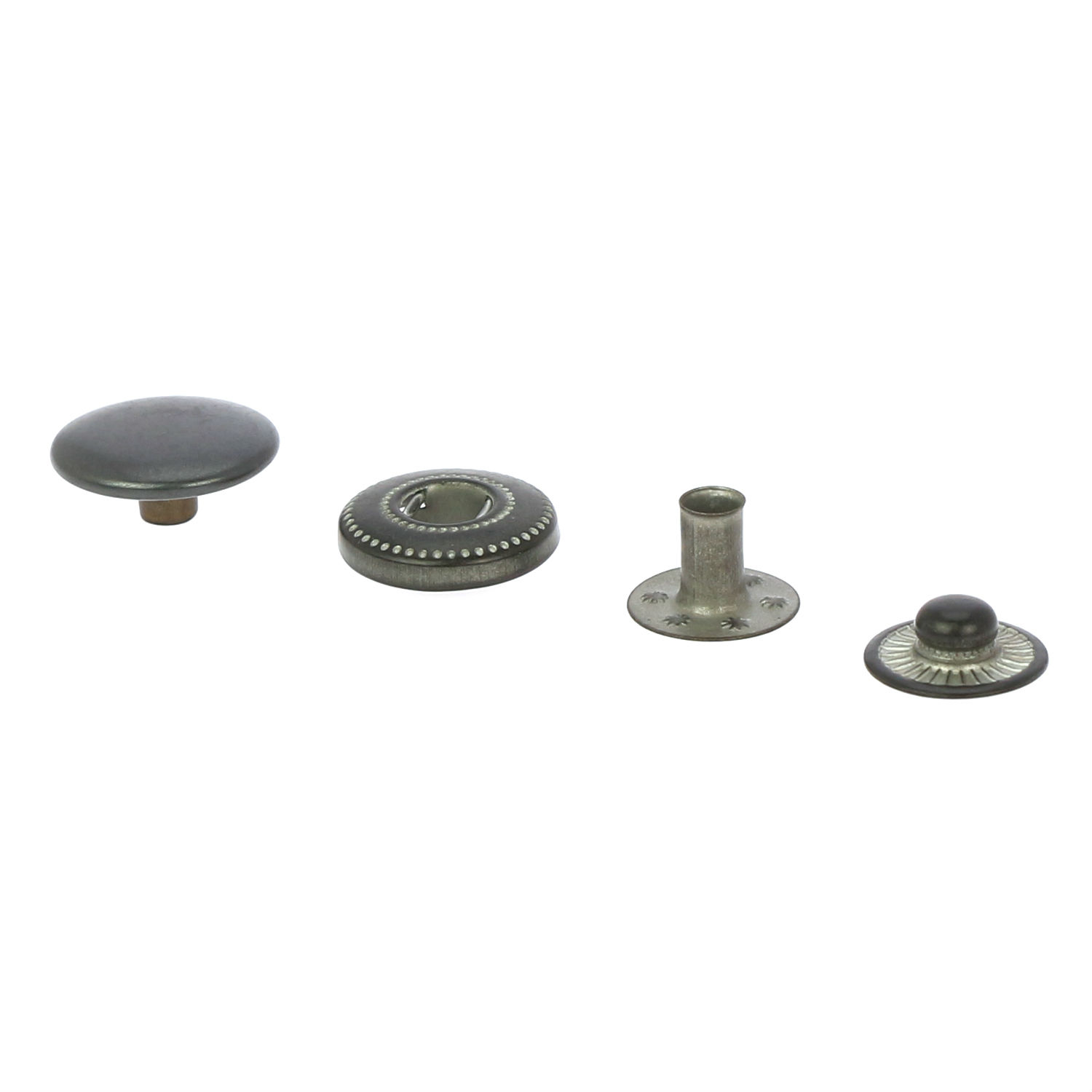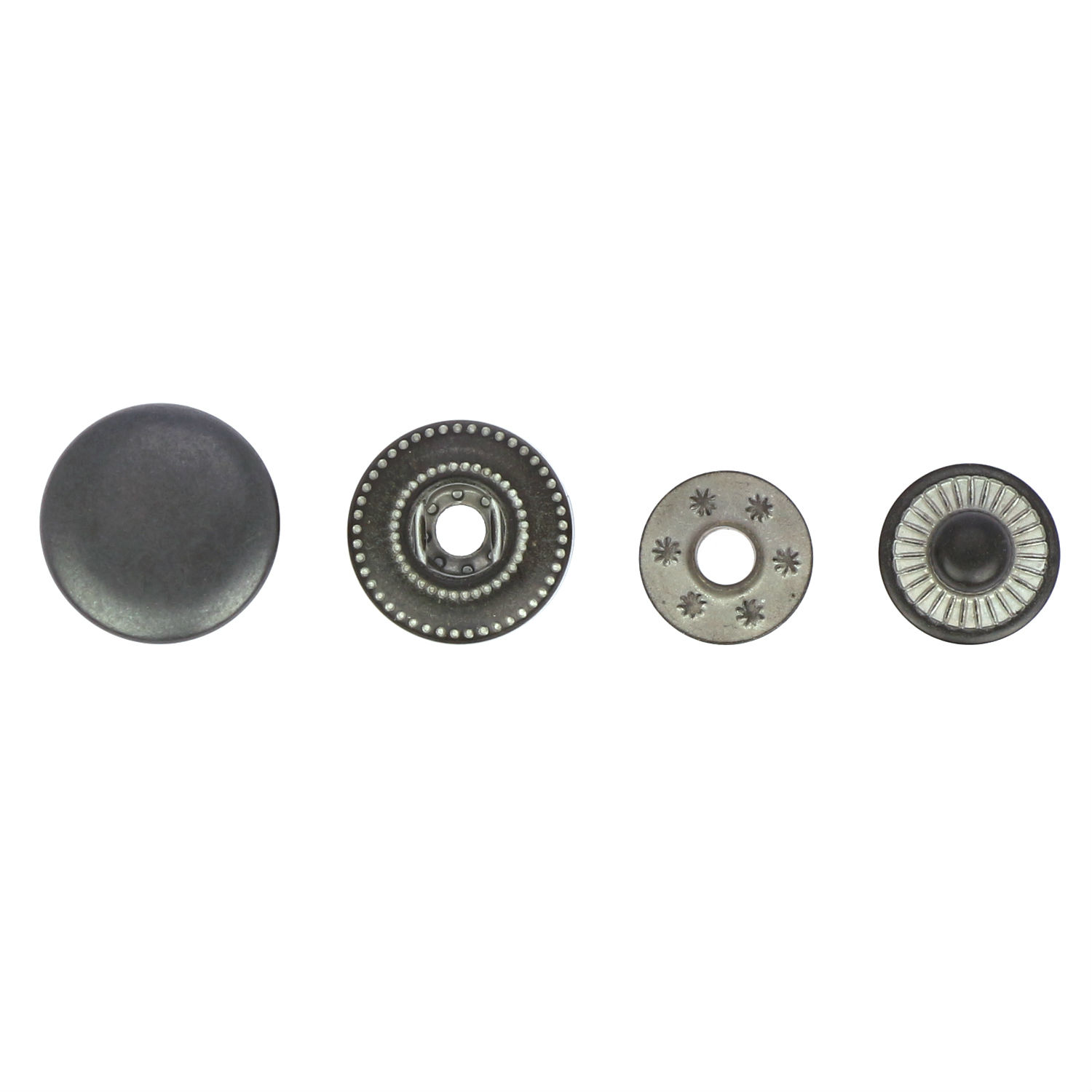 This metal spring snap button is round shaped and features a plated finish. It comes in a multi-part structure and is embellished with stars and other patterns. The button offers secure fastening and is excellent for replacing missing buttons.