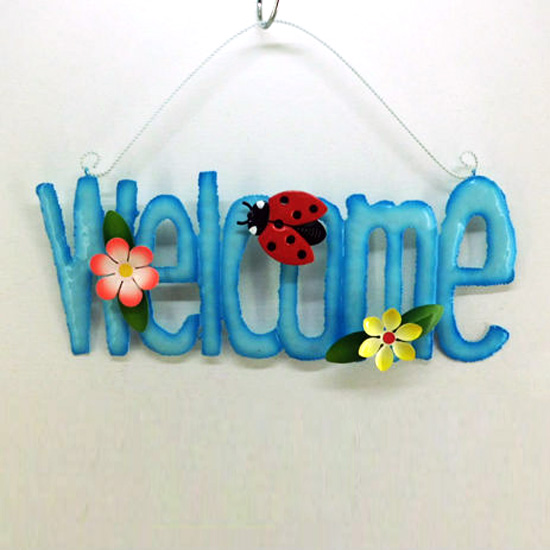 This welcome wall plaque in blue is accentuated with flower and ladybug decorations for a spring touch. It is constructed from metal for lasting performance. This exquisite wall plaque is ideal for home decoration.
