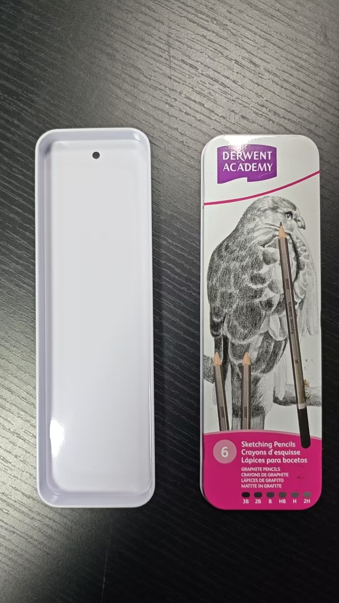 At the bottom of the magenta panel, a horizontal row of grade indicators (3B, 2B, B, HB, H, 2H) visually maps the tonal range of the set, from the soft, dark 3B ideal for bold shading to the hard, light 2H perfect for precise line work. This intuitive layout helps beginners understand how each pencil grade contributes to different artistic effects, turning the tin itself into a mini educational guide for tonal control.
