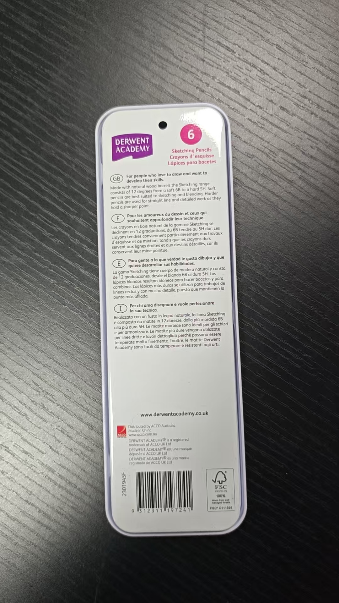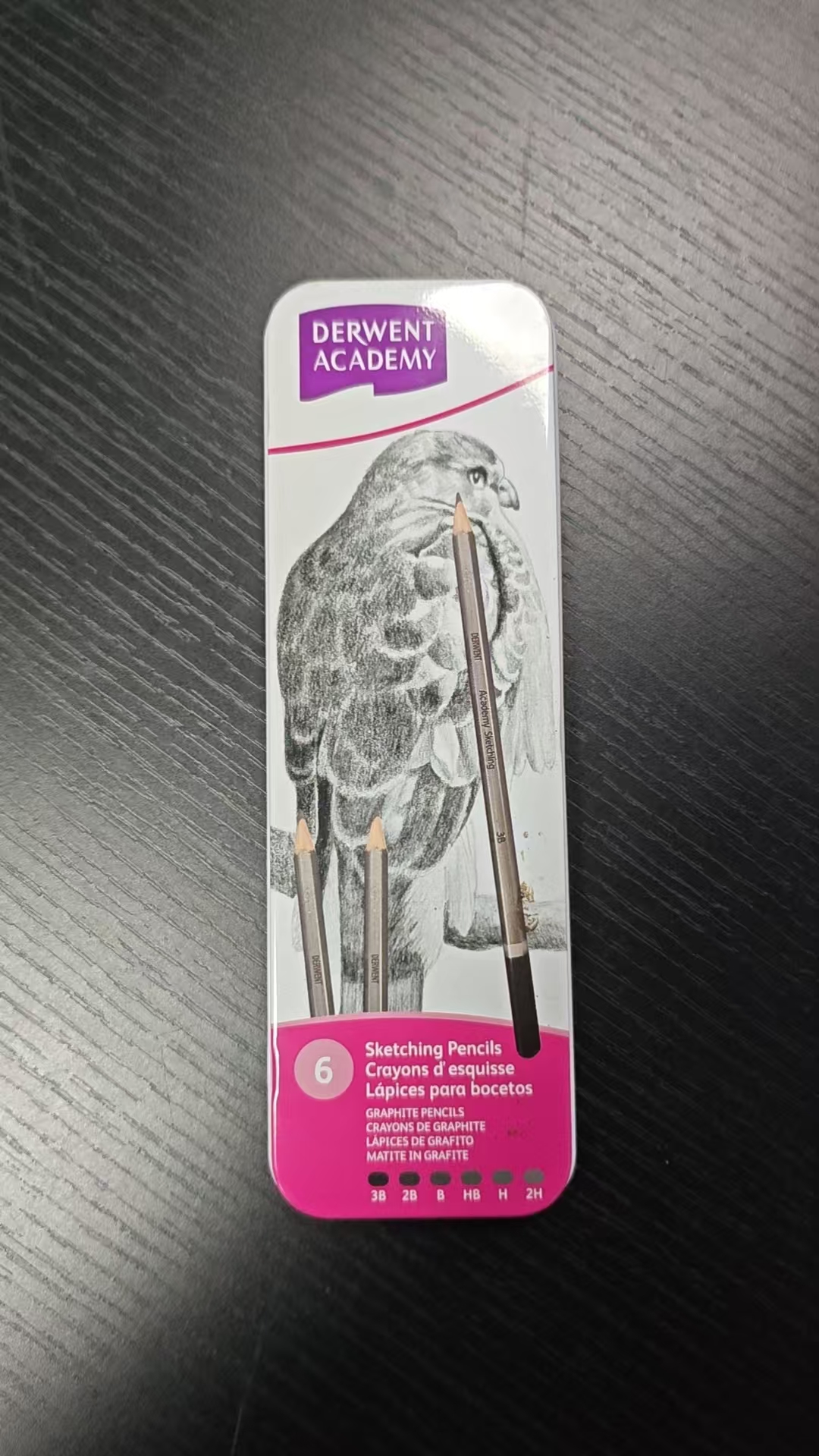 The lower portion of the tin is a vibrant magenta panel that provides clear, multilingual product information, ensuring accessibility for global users. The number “6” is prominently displayed, indicating the set size, followed by descriptions in English, French, and Spanish: “Sketching Pencils,” “Crayons d’esquisse,” and “Lápices para bocetos.” Below this, the text “GRAPHITE PENCILS” (repeated in French and Spanish) reinforces the core product type, while “MATITE IN GRAFITE” emphasizes the smooth, matte finish of the graphite leads.