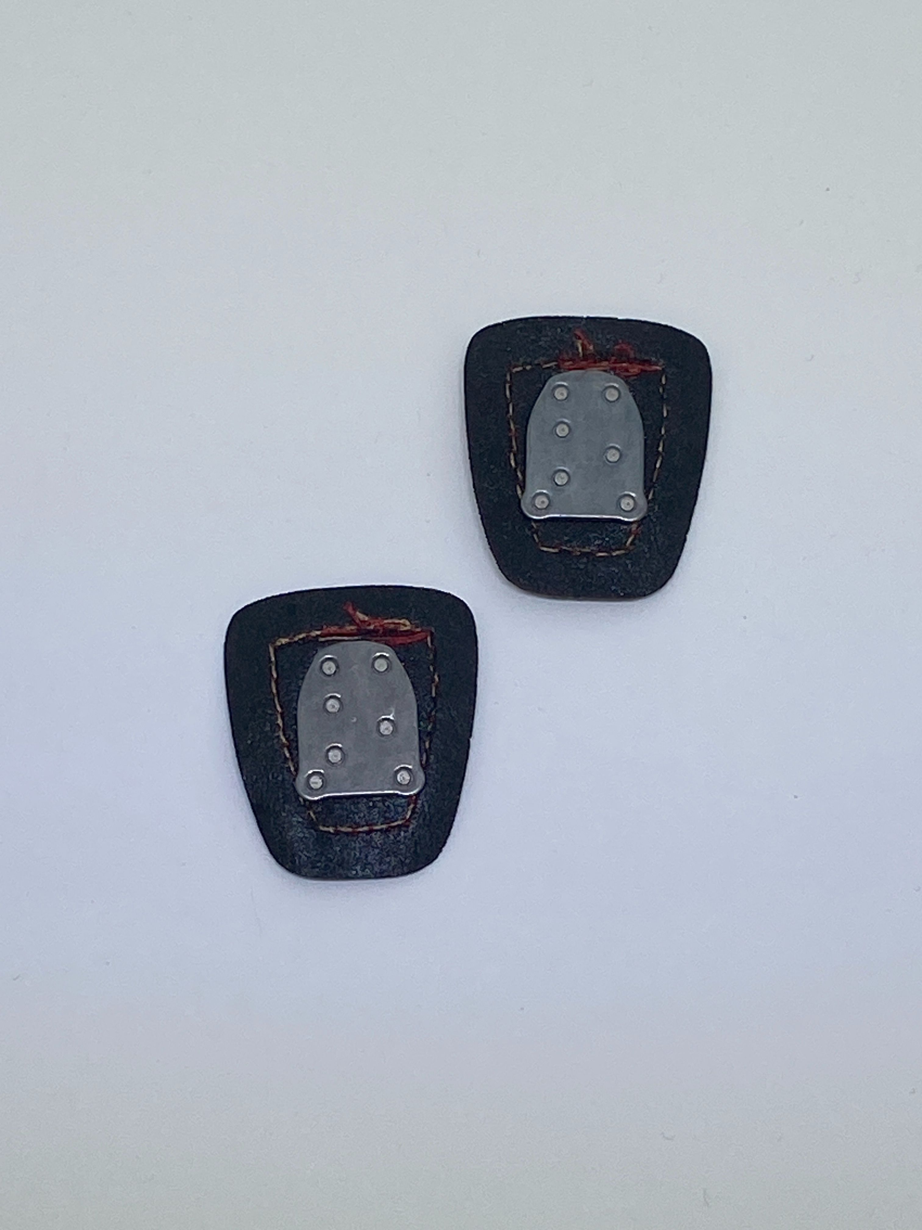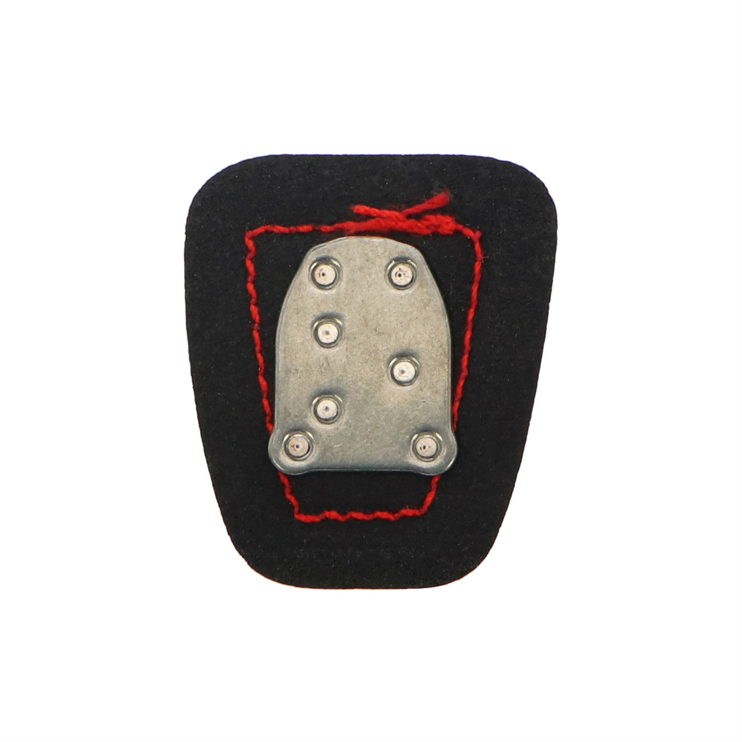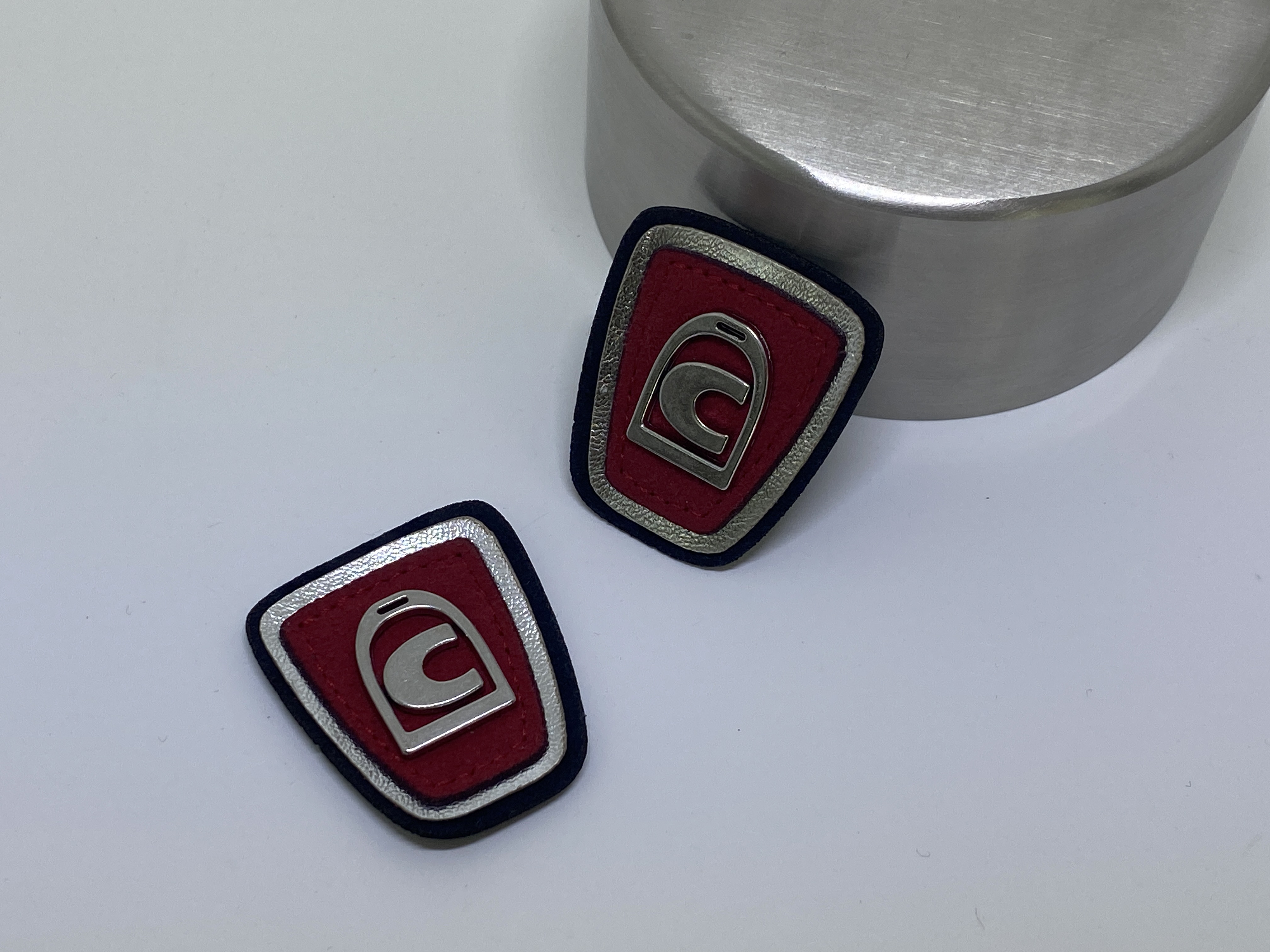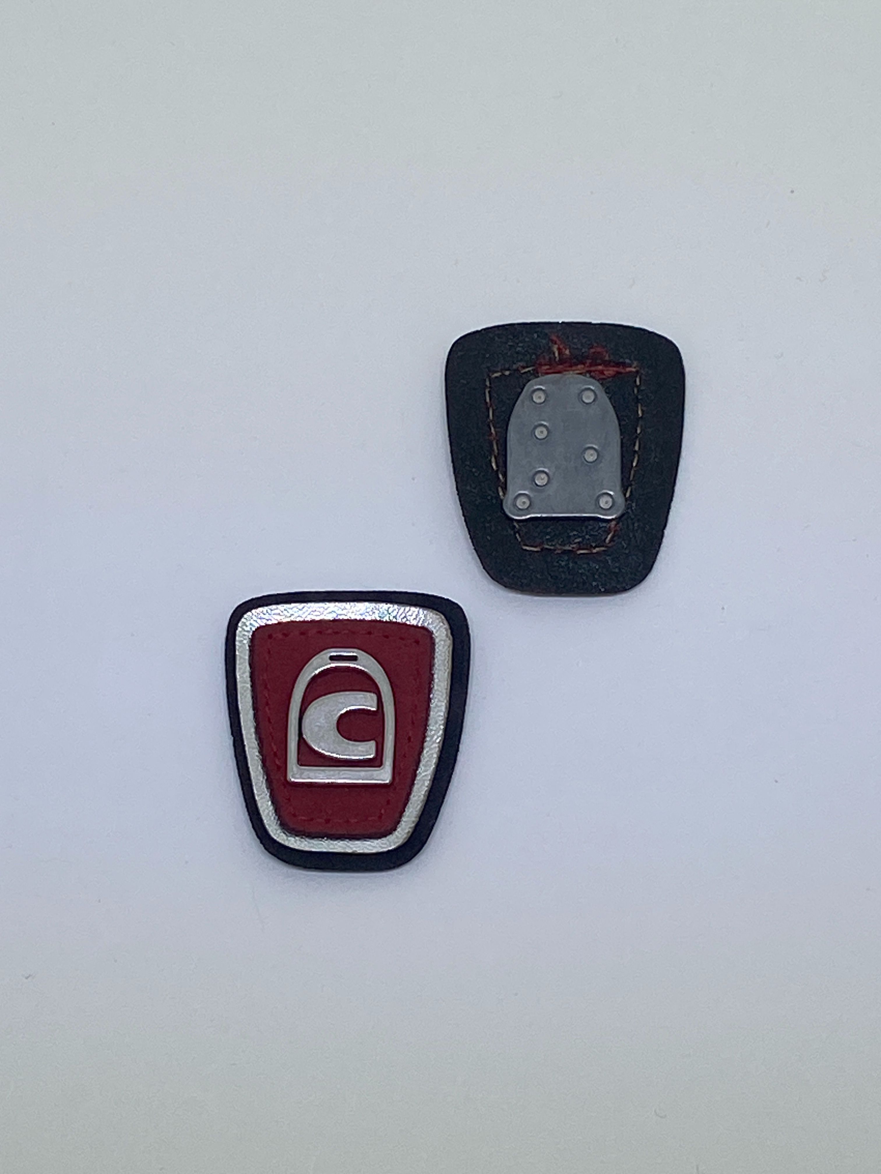 Finish your newly designed jacket by attaching this cool and fashionable patch to its breast pocket. This patch features a brass detail for an edgy look. It is also set on a red piece with matching stitches and wrapped around with a metallic silver fabric that echoes with the shimmering details for a put-together look. To ensure that the patch can blend in seamlessly with a wide range of outerwear, a black outer rim is employed. Spice up your new fall collection by getting this vibrant and stylish patch.