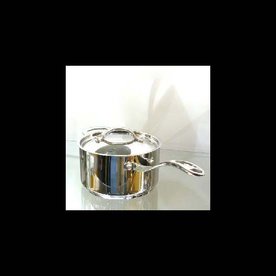 Displayed is a metallic pot which features a silvery mirror finish with top lid handle and side handle. The handles allow you to hold this metallic kitchen utensil with ease. The shimmering surface of this anodized kitchenware gives a contemporary sense to your house.