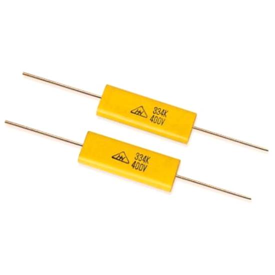 • Polyester film dielectric with vacuum-evaporated metal electrodes, axial leads of tinned wire are electrically welded to the contact metal layer on the ends of capacitor winding out wrapped with Mylar tape and ends sealed with epoxy resin.