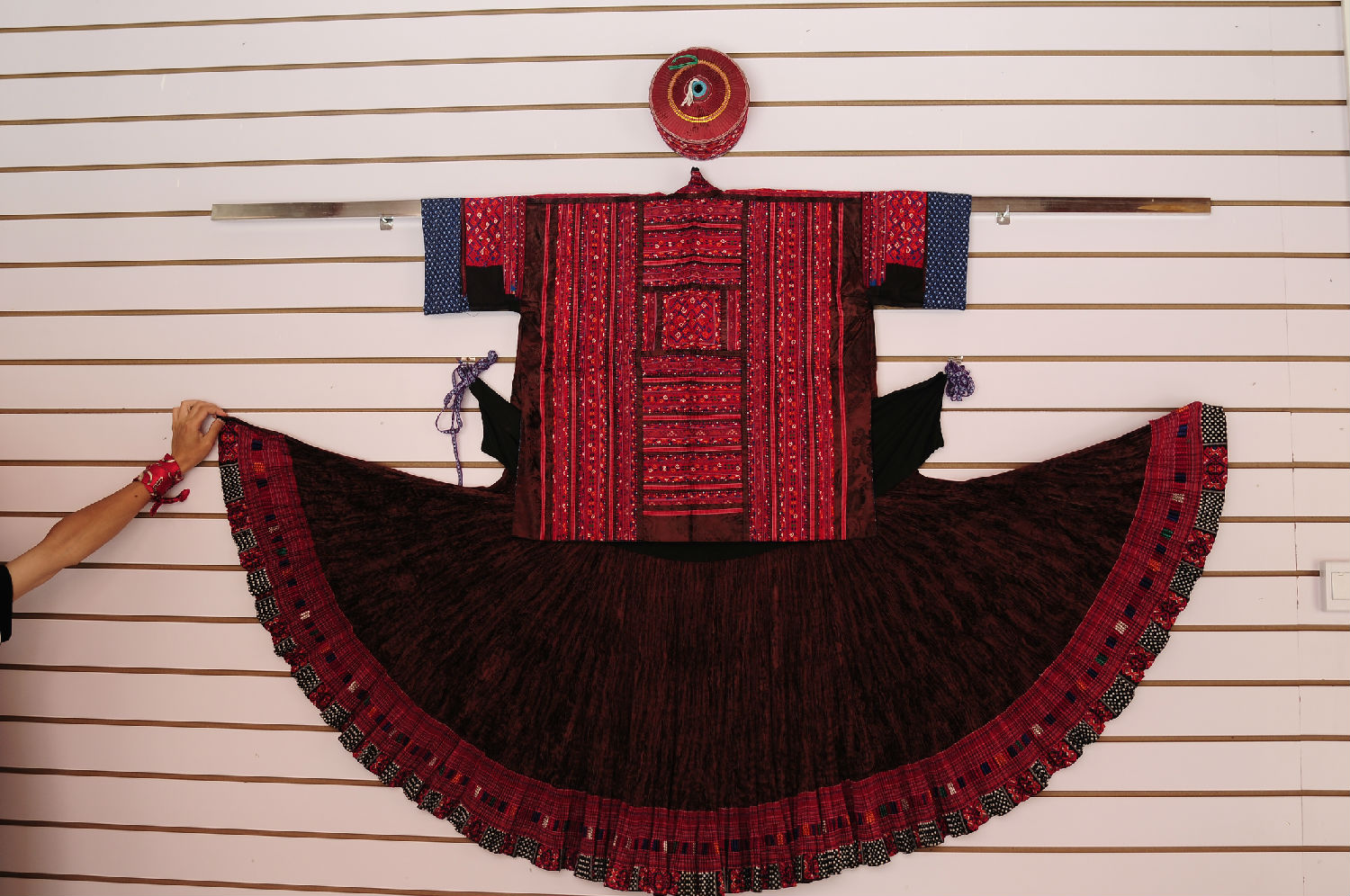 To sustain and bring forward Miao’s unique culture, this ethnic minority group welcome people with different ethnicities to wear their traditional clothing. This fabulous set includes a perfectly match top and bottom. The short-sleeve loose fit top features striped printings and piped cuffs while the bottom comes with a feminine skirt with patterned hem. A curtsey can showcase the beauty of this skirt since it is designed like a spread peacock feather. Remember to complement your final look with the little round hat.