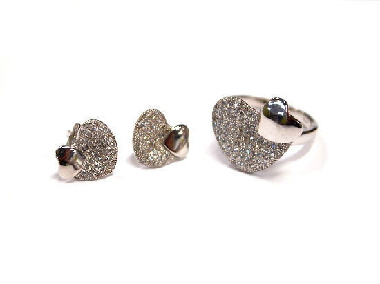 Heart shape jewelry set comes with ring and pair of earrings. It fully paved with shiny white cubic zirconia. It is sparkling and eye catching when wearing it. It would be the great gift to your beloved one.