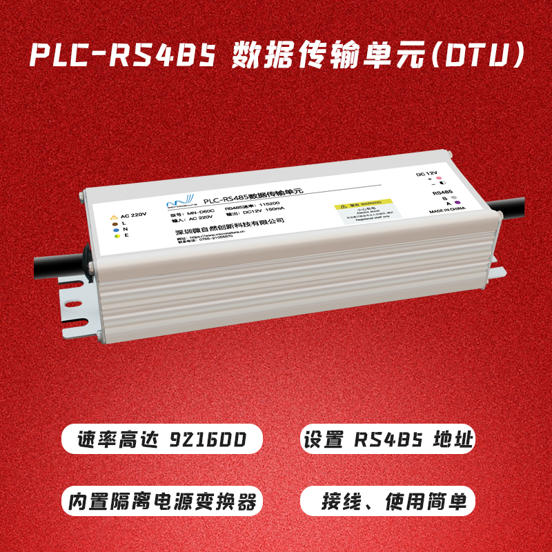 MicroNature MN-D60C PLC-RS485 Data Transmission Unit (DTU) utilizes a high-performance CORTEX chip to achieve simultaneous transmission of medium-speed PLC (Power Line Carrier) and traditional RS485 signals, directly transmitting effective communication data content.
