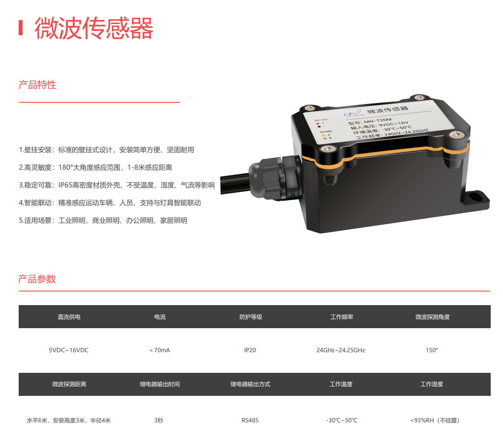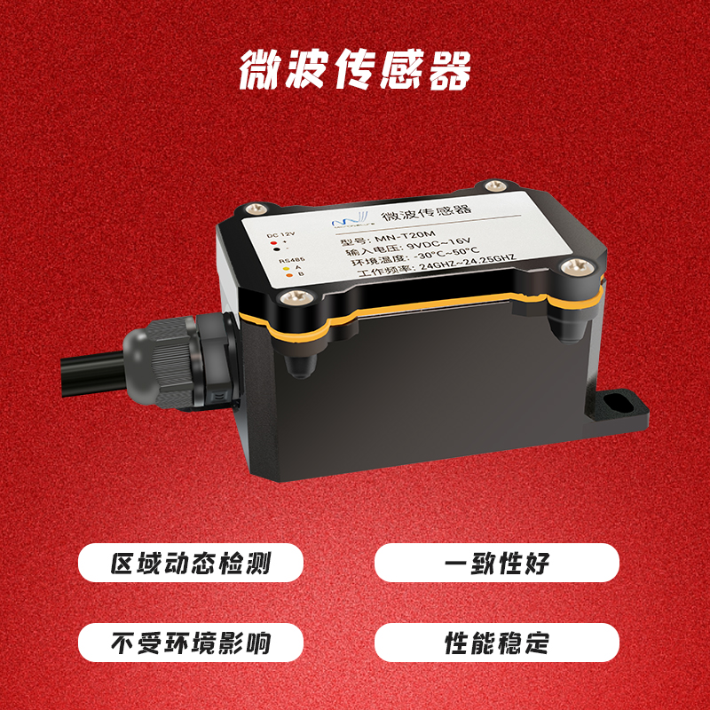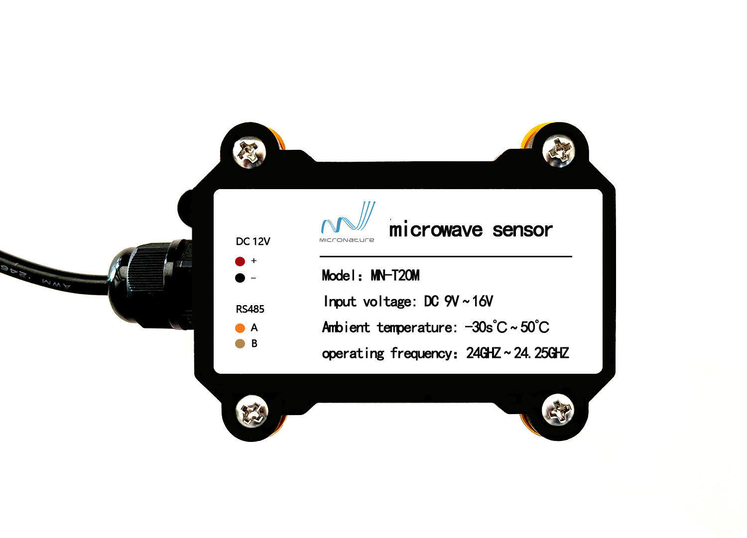MicroNature MN-T20M Microwave Sensor is a motion sensor designed to detect moving objects using a 24GHz microwave signal based on the Doppler radar principle. When the sensor detects movement, it outputs 485 data. Its main application is dynamic detection in various areas, offering good consistency, stable performance, and easy installation.