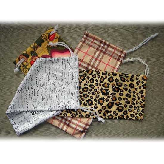 Showcased is a series of drawstring microfiber eyeglasses pouches designed in various patterns and colors. Models of customized size, logo and weight can be produced. This lightweight and beautiful pouch protects your glasses from scratch and damage too.