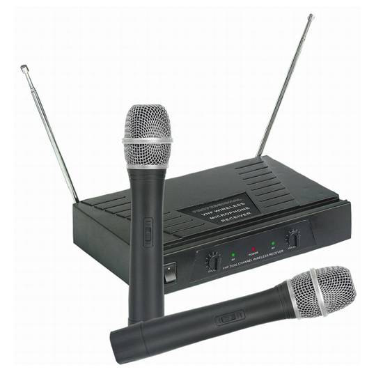 As shown is a microphone set which includes 2 wireless microphones and a microphone receiver. With 2 antennas, the efficiency and quality of the transmission of signals are high. With indications below function keys, the microphone set is user-friendly in terms of operation.