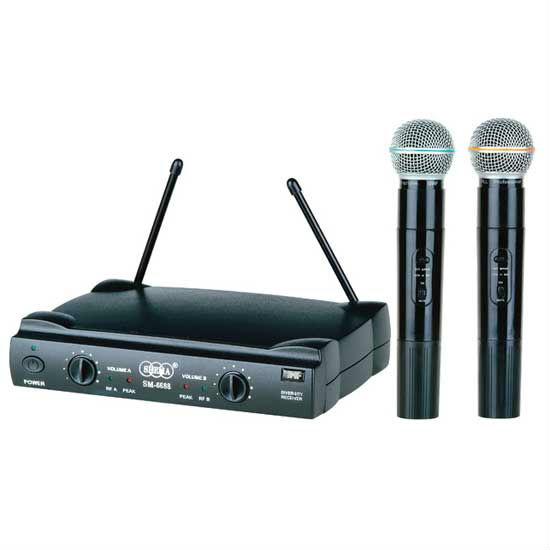 Featured here is a wireless microphone system with two microphones. The advanced wireless microphone set transmits audio signals efficiently. This wireless microphone system is ideal for schools, small clubs and pubs.