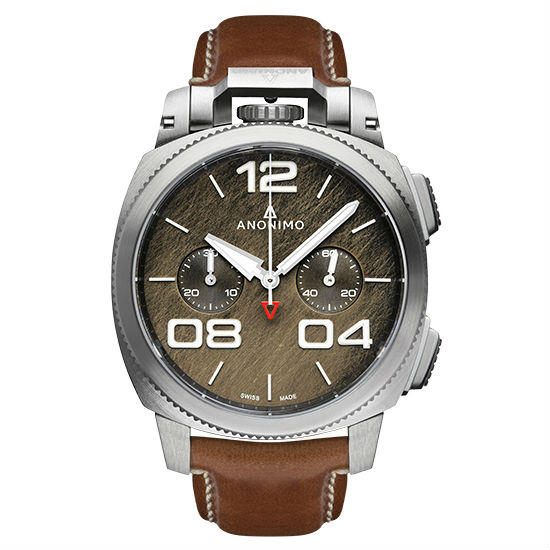 This handsome mechanism watch from Anonimo combines a vintage look with modern simplicity. It has a cushioned-shaped stainless steel case and a padded brown leather strap. The aged dial displays hours and minutes with significant markers and has a small second dial at 3 o’clock. With the markers and hands filled with luminescent materials, the piece supports your adventure with 24-hour visibility.
