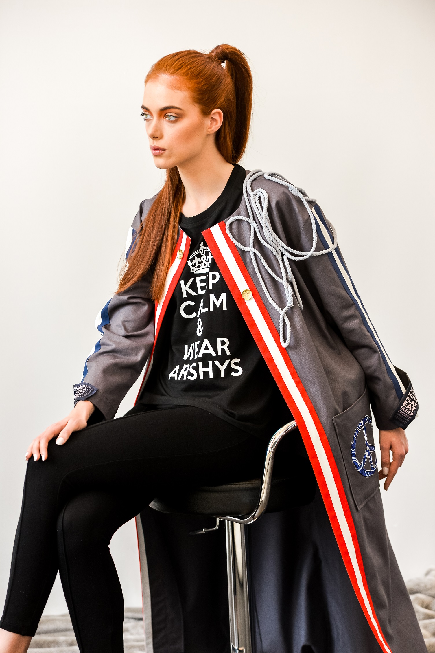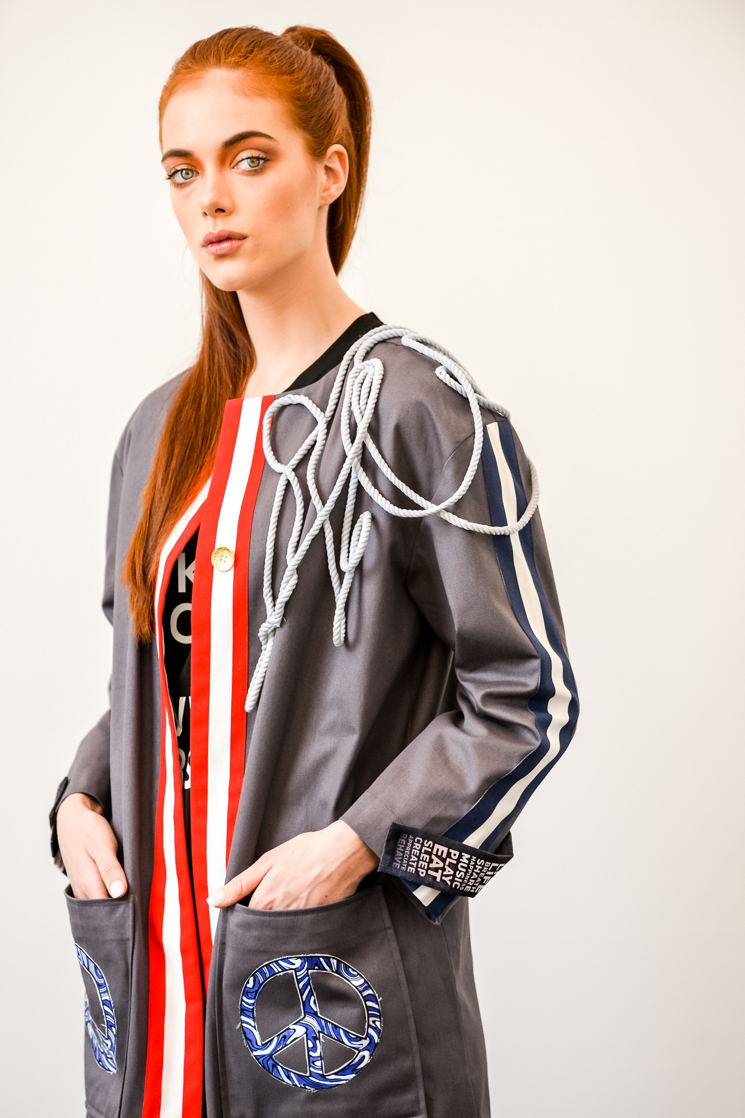 • Military inspired long coat with hand painted peace pockets and hand embellished rope accents.