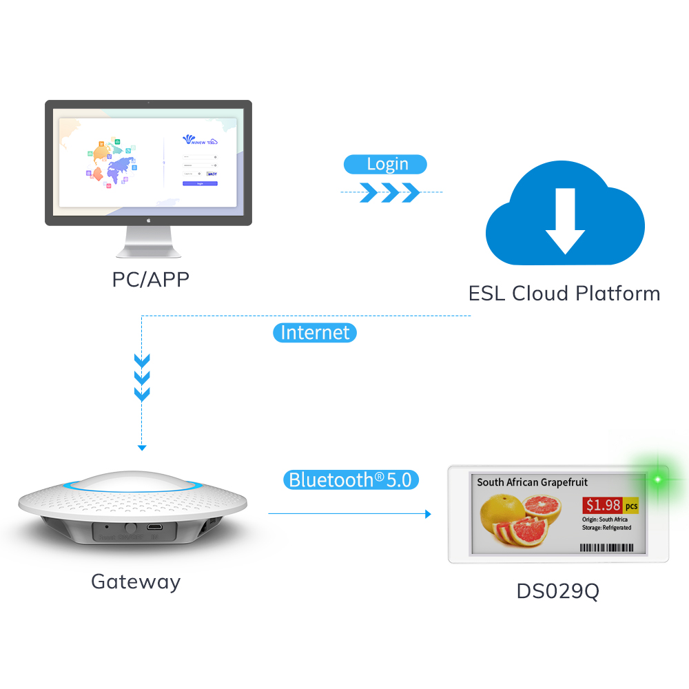 Q2: How Does Your Solutions Work? A2: Minew ESL solution consists of the software (the Cloud Platform) and the hardware (Gateway + ESLs).