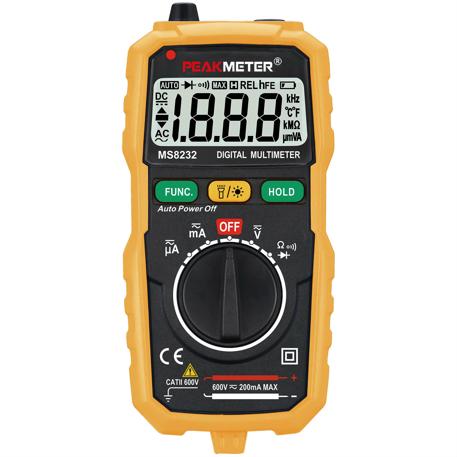 3 1/2 digits LCD display with unit annunciators, max. reading 1999 Non-contact AC voltage detection (NCV) Data hold for easy reading Torch light and LCD backlit Auto ranging, auto power-off Side attachable test leads Ideal for hobbyist and DIY users Safety as per IEC1010-1 Cat.II 600V Technical specifications: DCV: 200m/2/20/200/600V, ±0.5% ACV: 2/20/200/600V, ±0.8% DCA: 200m/2m/20m/200mA, ±1.8% ACA: 200m/2m/20m/200mA, ±2.0% OHM: 200/2k/20k/200k/2M/10MΩ, ±1.0% Audible continuity & diode test Dimensions: 62x130x27 mm Weight: approx. 150g Battery: 1.5Vx2, AAA size